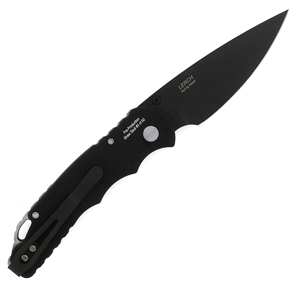 This model features black anodized 6061-T6 aluminum handle scales with an inlaid Bruce Shaw .925 Sterling Silver Skull. The handle is etched on the back side ".925 Sterling Shaw Skull". Black DLC finished 154-CM stainless steel drop point blade etched PRO-TECH USA 154-CM - LERCH Spring Assist. Two tone finished stainless steel glass breaker and lanyard loop. Jimping on the spine. Genuine black lip pearl inlaid button for the lock. Fires out hard and locks up solid. Removable black pocket clip for tip-up carry. Serial number #48 of 50. Customer trade in like new in box with sheath.