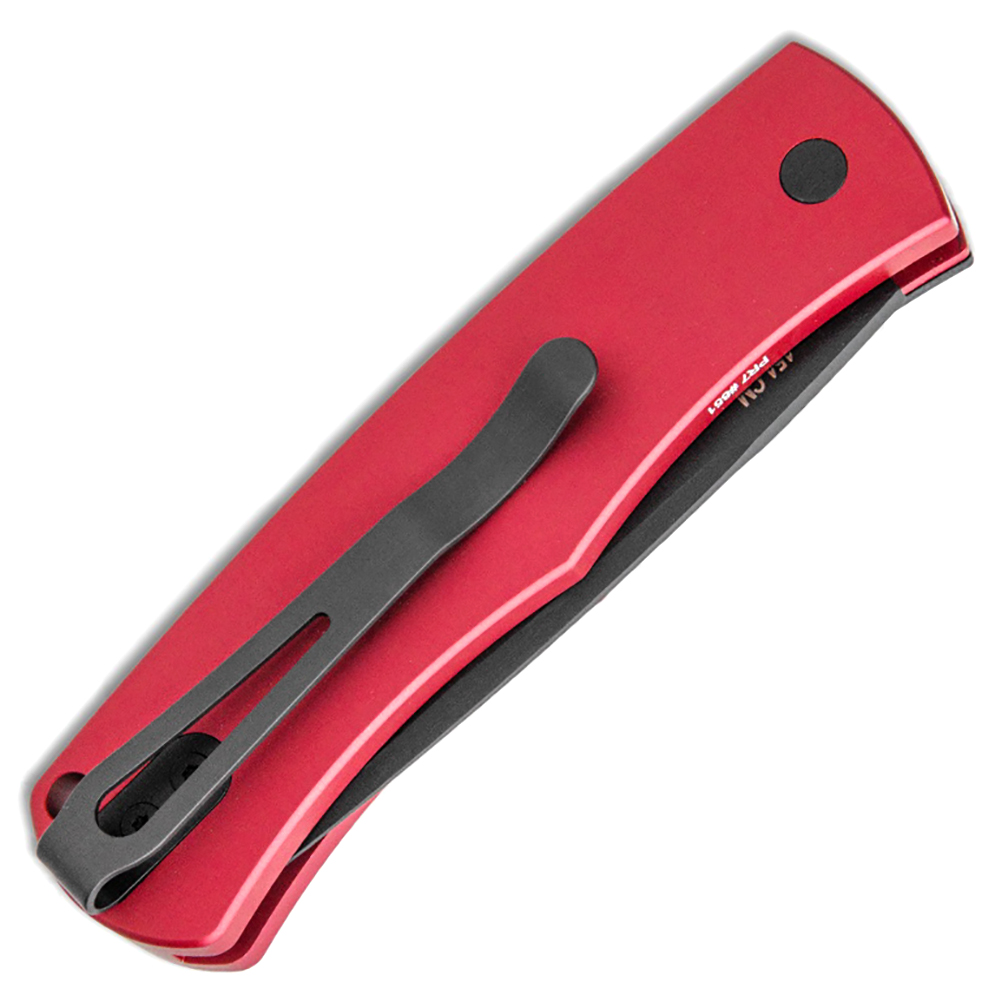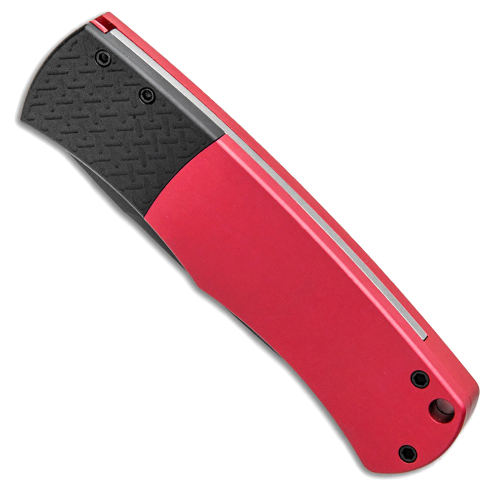 This model features red anodized 6061-T6 aluminum handle scales with a checkered patterned bolster release section. Black DLC finished 154-CM stainless steel drop point blade. Black finished hardware and black DLC finished pocket clip. Brand new in box.