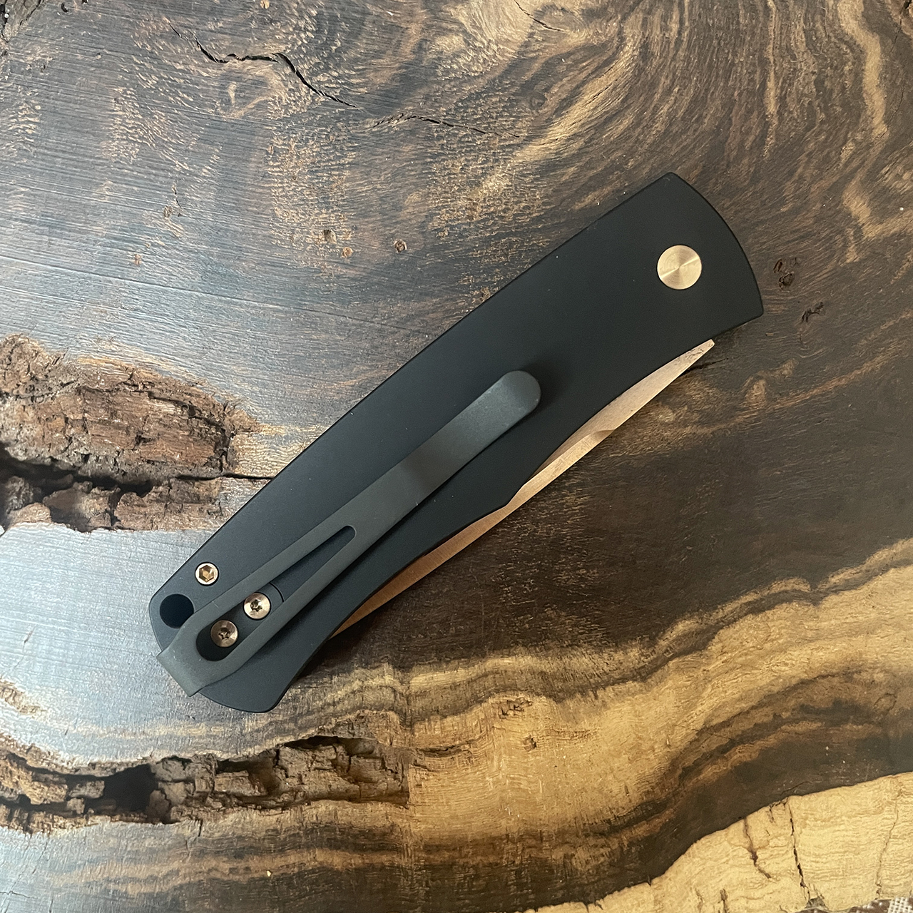 This model features black anodized 6061-T6 aluminum handle scales with a patterned bolster release section. Rose Gold finished 154-CM stainless steel drop point blade. Rose Gold finished hardware. Brand new in box.