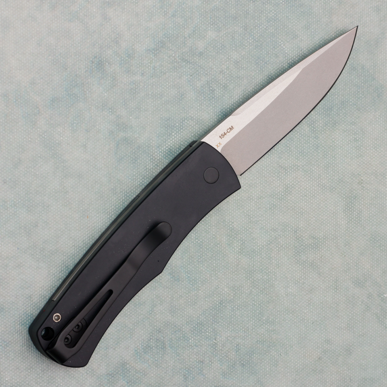 This model features black anodized 6061-T6 aluminum handle scales with a checkered patterned bolster release section. Stonewash finished 154-CM stainless steel drop point blade. Satin finished hardware and black DLC finished pocket clip. These function as they should, but have cosmetic blemishes in the blade finish or handle. The blemish is not available for warranty on the cosmetic blemish. They are marked with XX on back of the blade to identify that they are blems. Brand new in box.