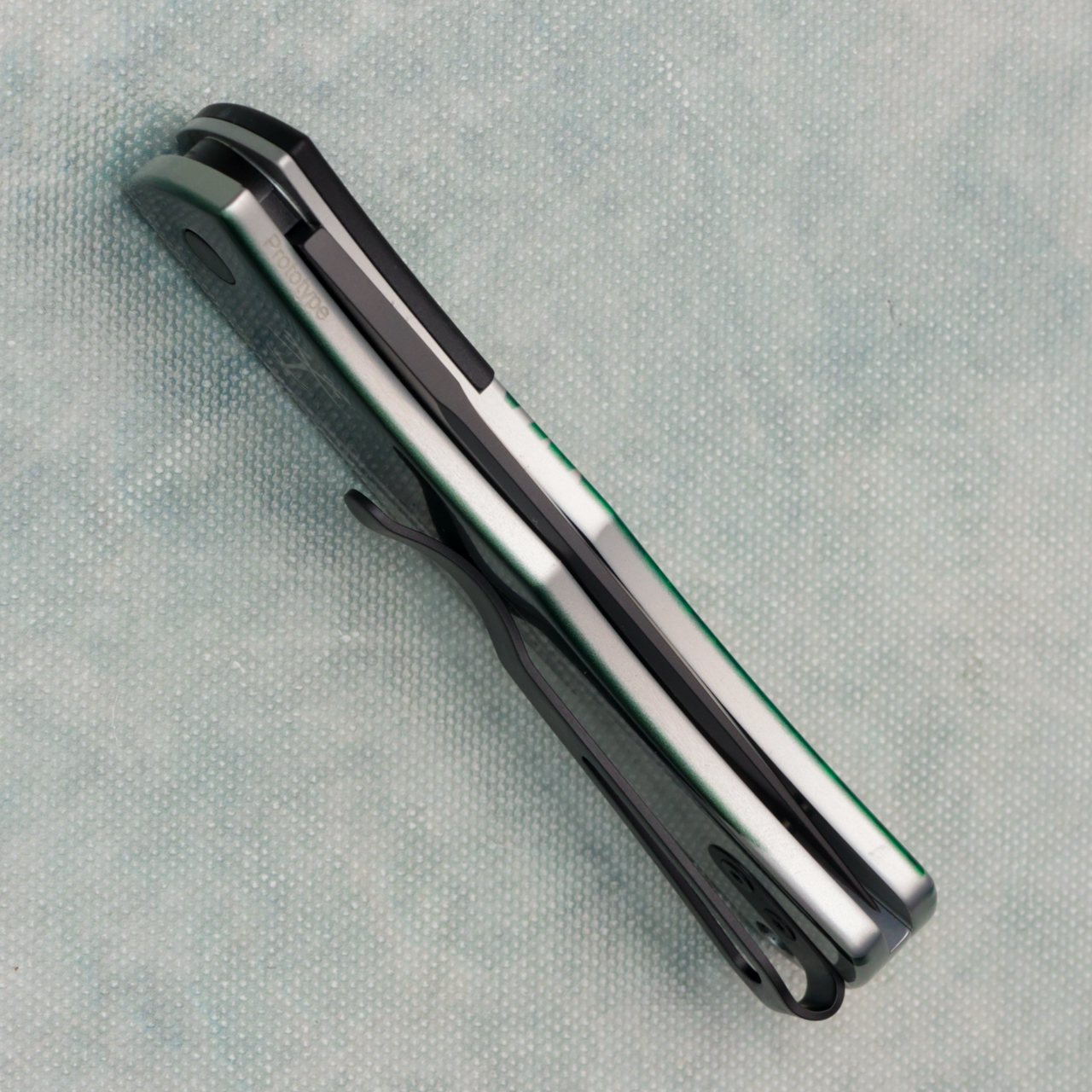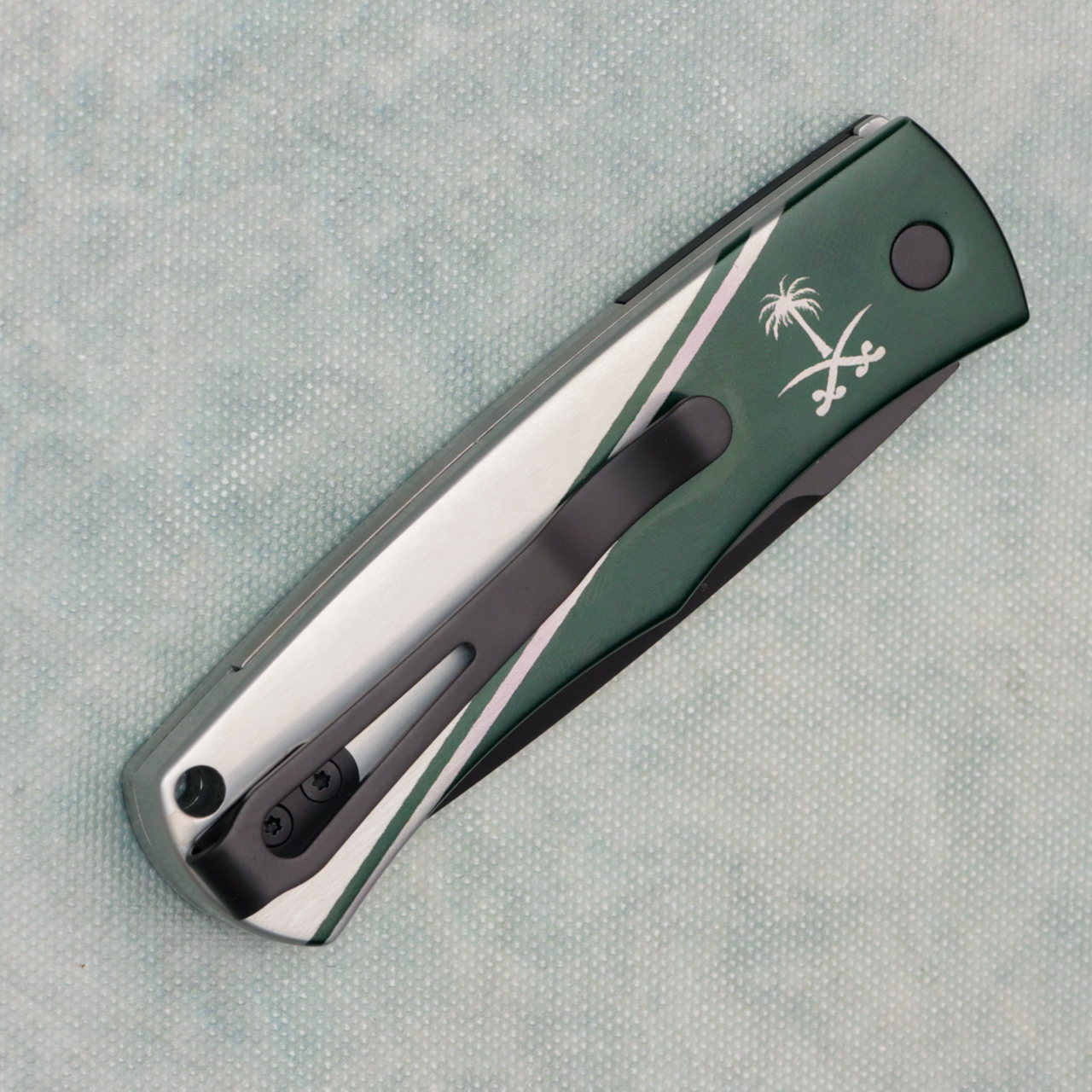 The Magic BR-1 is a Whiskers Allen design that features a hidden bolster release; a simple, deliberate slide of the front bolster deploys the blade and also unlocks it. Polished PK Saudi Arabia anodized 6061-T6 aluminum handle with a black finished patterned bolster release. Black DLC finished 154-CM stainless steel drop point blade. The blade is marked with the ProTech logo and model information. Black DLC finished tip up deep carry pocket clip and hardware. This is an awesome knife from Pro-Tech and custom knife maker Mike "Whiskers" Allen. Extremely rare PROTOTYPE Peter Kellet. Brand new in box.