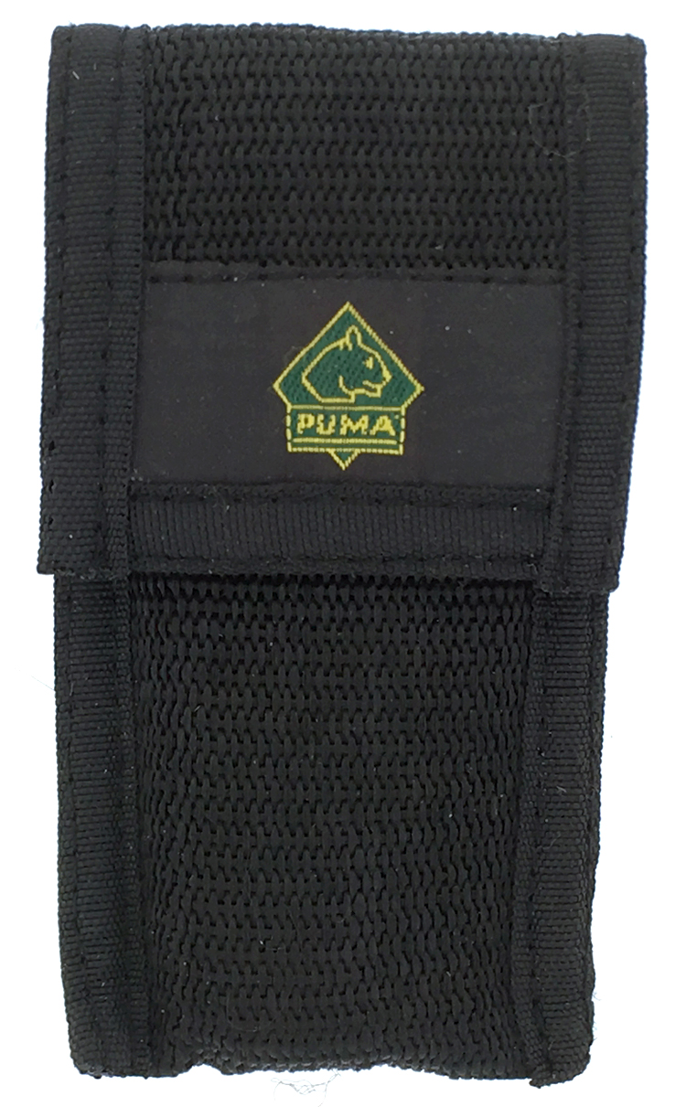 This fine, handmade knife is a small lock back and has green ABS handles, matte finished stainless steel bolsters and liners. Blade is high carbon stainless steel with long nail pull. Does have a small crack in the handle by inlaid shield. Brand new in box with Puma nylon sheath.
