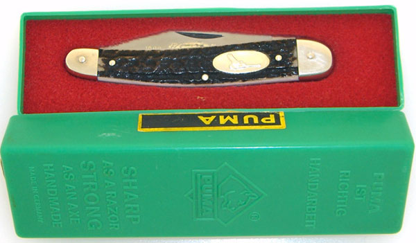 Rare, Limited Edtion. Made for A.G. Russell back in 1974. Real nice stag handles, Nickel silver bolsters, handle pins and inlaid shield with a Luger Pistole 08 on it. Has serial #02626 on back front bolster. The clip point blade has real strong snap and is gold etched 1900 Luger Pistole 08 1974. Comes in old style green plastic two piece Puma box. Great old knife that is number CM-3 in the Knife Collectors Club. There was 3,600 of these made the first 1200 had the 9mm cartridge shield and the last 2400 had the Luger shield just as this one does.