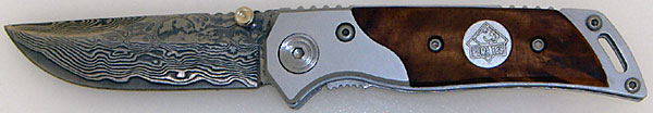 Brushed stainless handles with beautiful Thuya wood onlays. Damascus steel blade with thumbstud for easy one hand opening. Lanyard holes. Stainless pocket clip. Brand new in box.