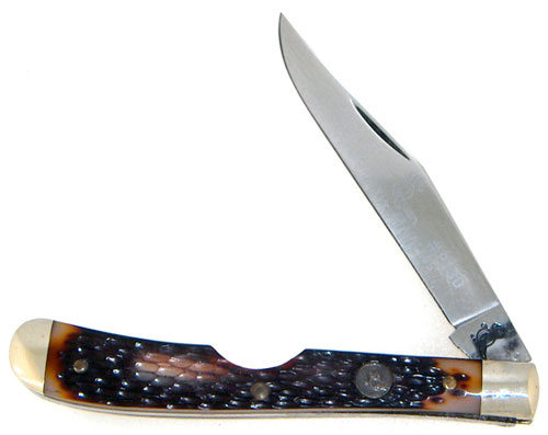 Real nice jigged brown bone handles. High polished stainless steel clip point blade has strong snap and is etched QUEEN STAINLESS #9130 Tang stamped Q U.S.A. Brass liners and handle pins. Nickel silver bolsters. Inlaid oval Queen shield. Awesome Queen knife.