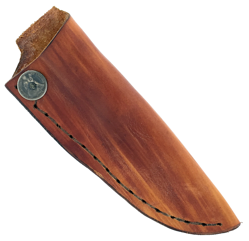 This knife has a simple yet sophisticated design. Beautiful ivory micarta handle scales with a nice scrimshaw scene of a wolf howling at the moon. Brass handle pins. Full tapered tang with black liners between the tang and scales. This knife was forged from 3/16 stock. Mirror polished 154-CM stainless steel drop point hunting blade. Finger choil for excellent grip. The tang is stamped R.B. JOHNSON - #7 of 10 1978 Call of the Wild. This is a gorgeous early vintage R.B. Johnson custom hunter made in 1978. This is number #7 of only 10 made ever. Comes mint with handmade form fitted leather belt sheath that has an 1876 US silver dime in the top corner.