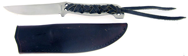 This knife has a simple yet sophisticated design. Solid one piece construction of D2 tool steel all with a hand satin finish and integral guards. The handle section has machined holes with a braided leather handle grip weaved through the holes. The braided leather extends beyond the handle to make a nice lanyard. Tang is etched with R.B. Johnson's signature. The clip point hunting blade has an excellent shape. Raised thumb ramp has jimping to give better grip and control while in use. Comes brand new with a hand made form fitted leather sheath.
