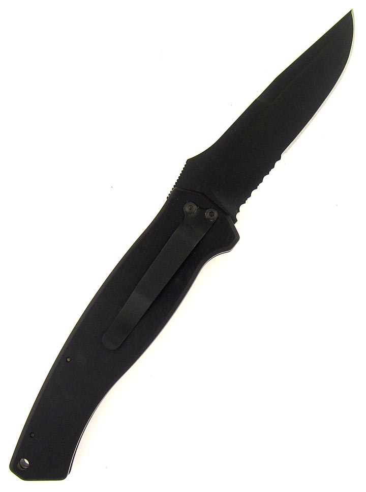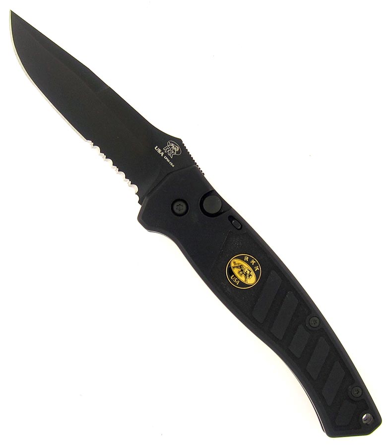 Randall King's automatic Swift Striker I is a great knife with a super price! Larger than the Swift Striker 2, this knife features a CPM-154 blade with a DLC black finish and a partially serrated edge. The blade comes razor sharp, fires with a nice snap and locks securely into place. The knife body is anodized black T-6 aluminum. It’s got a good feel and outstanding overall quality. There's a sliding safety on the front that works flawlessly and a pocket clip to make carry easy.