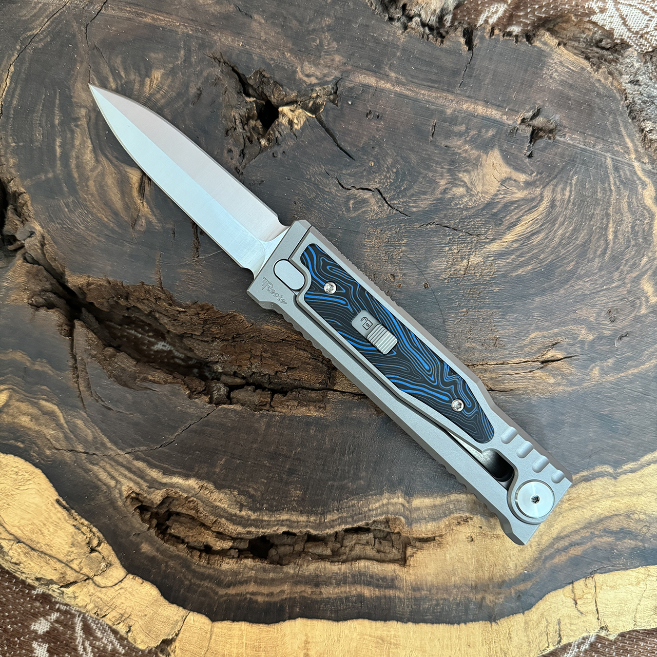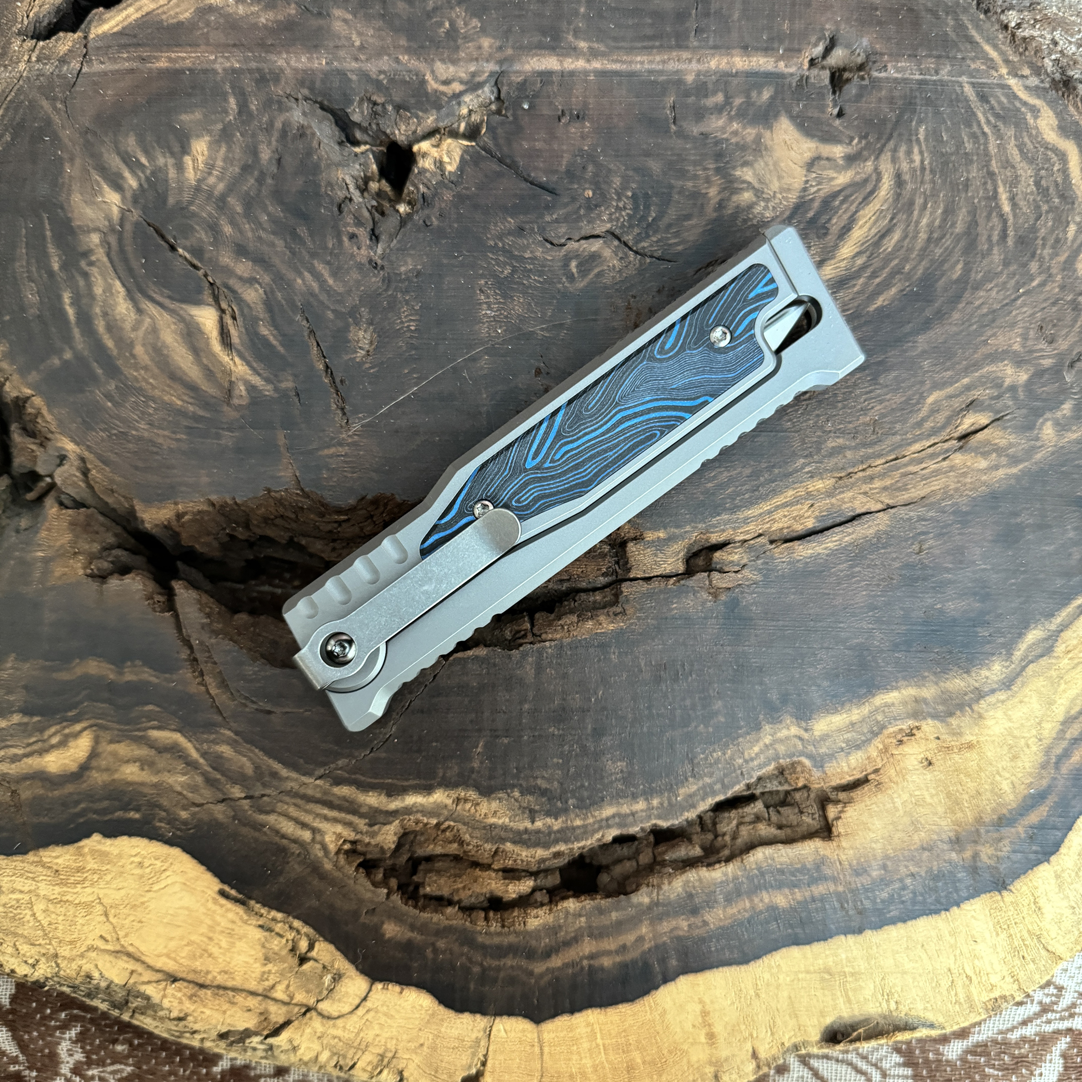 Reate EXO M D/E Gravity Knife Titanium Handle w/ Blue Black G10 Damascus Pattern Inlay Satin Standard Blade