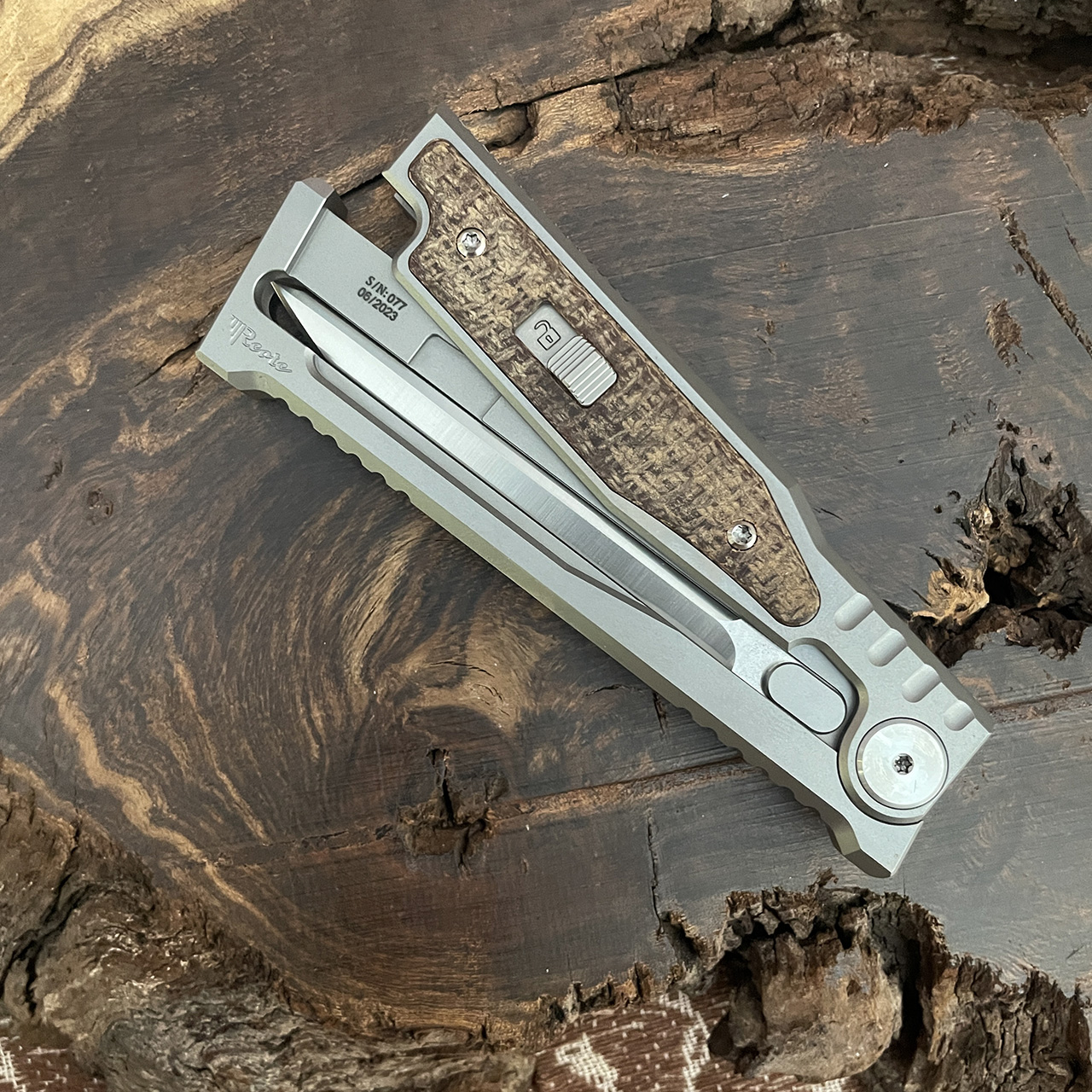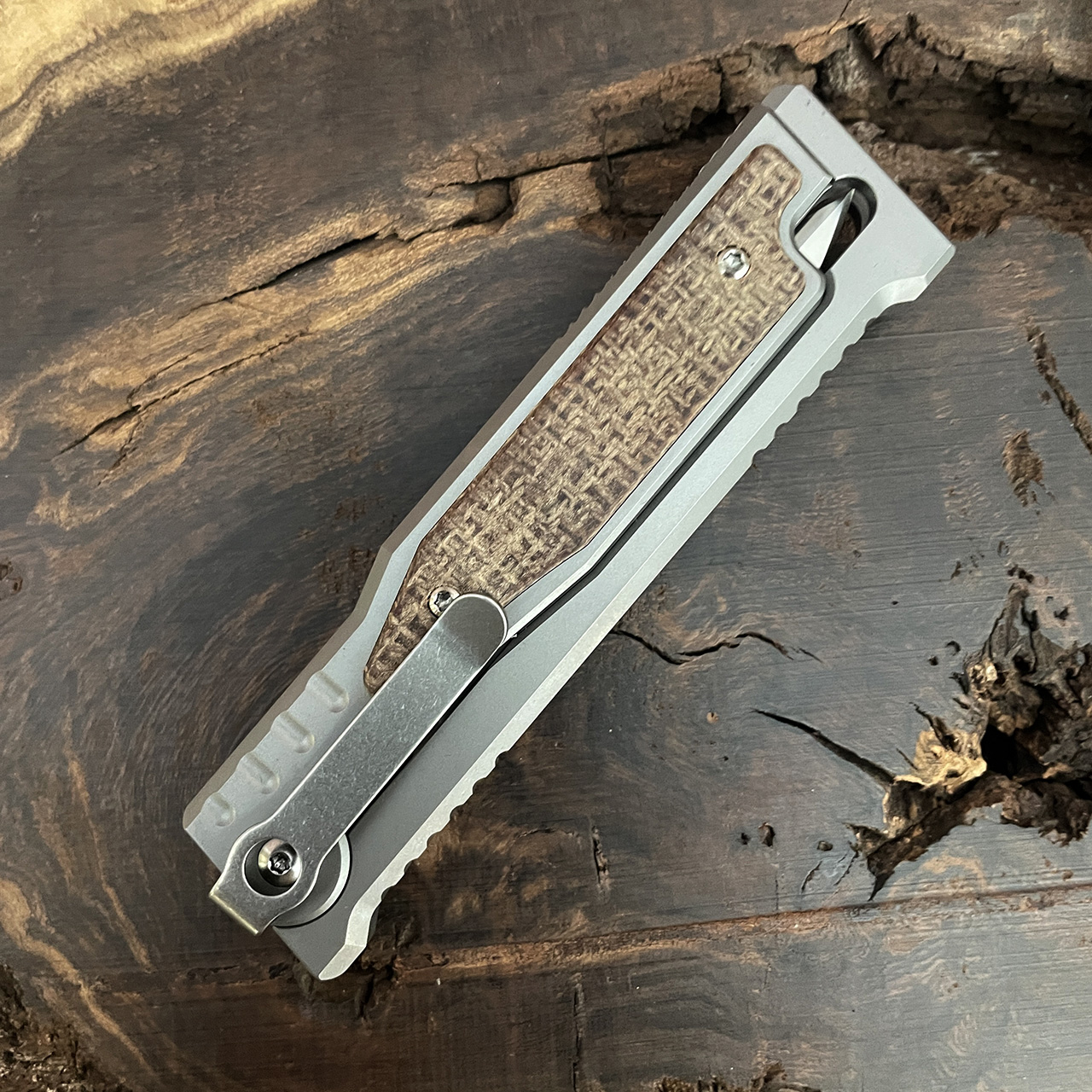 Reate EXO M D/E Gravity Knife Titanium Handle w/ Burlap Micarta Inlay Satin Standard Blade