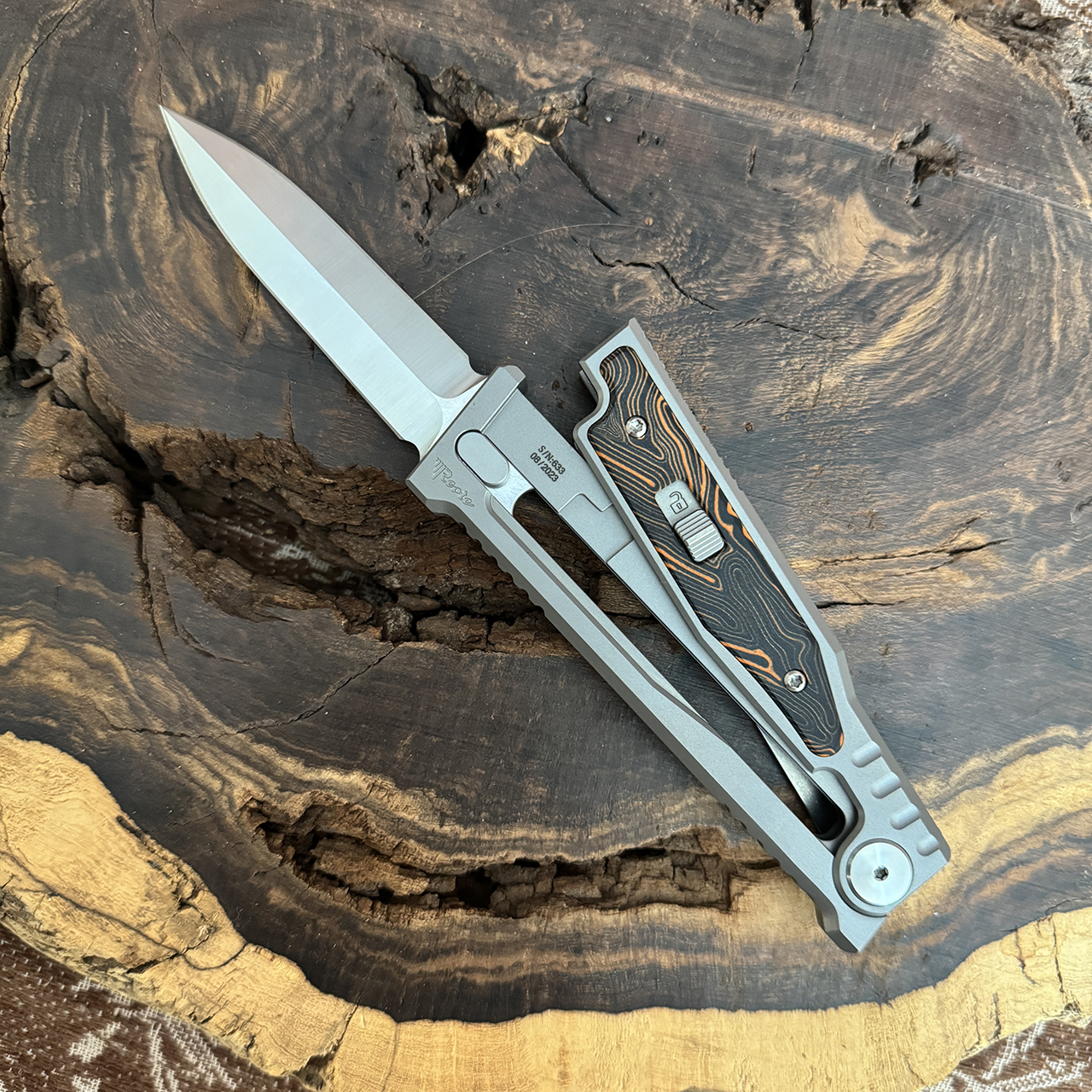 This model features a titanium handle with orange and black G10 Damascus Pattern inlay. Satin finished ELMAX double edge dagger blade. Comes with original box and accessories.