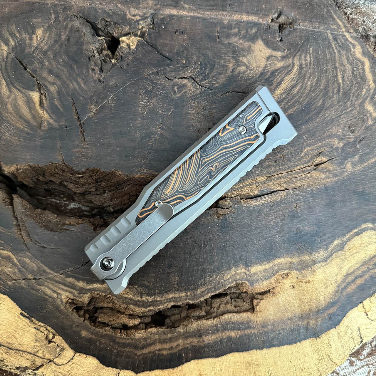 Reate EXO M D/E Gravity Knife Titanium Handle w/ Orange Black G10 Damascus Pattern Inlay Satin Standard Blade