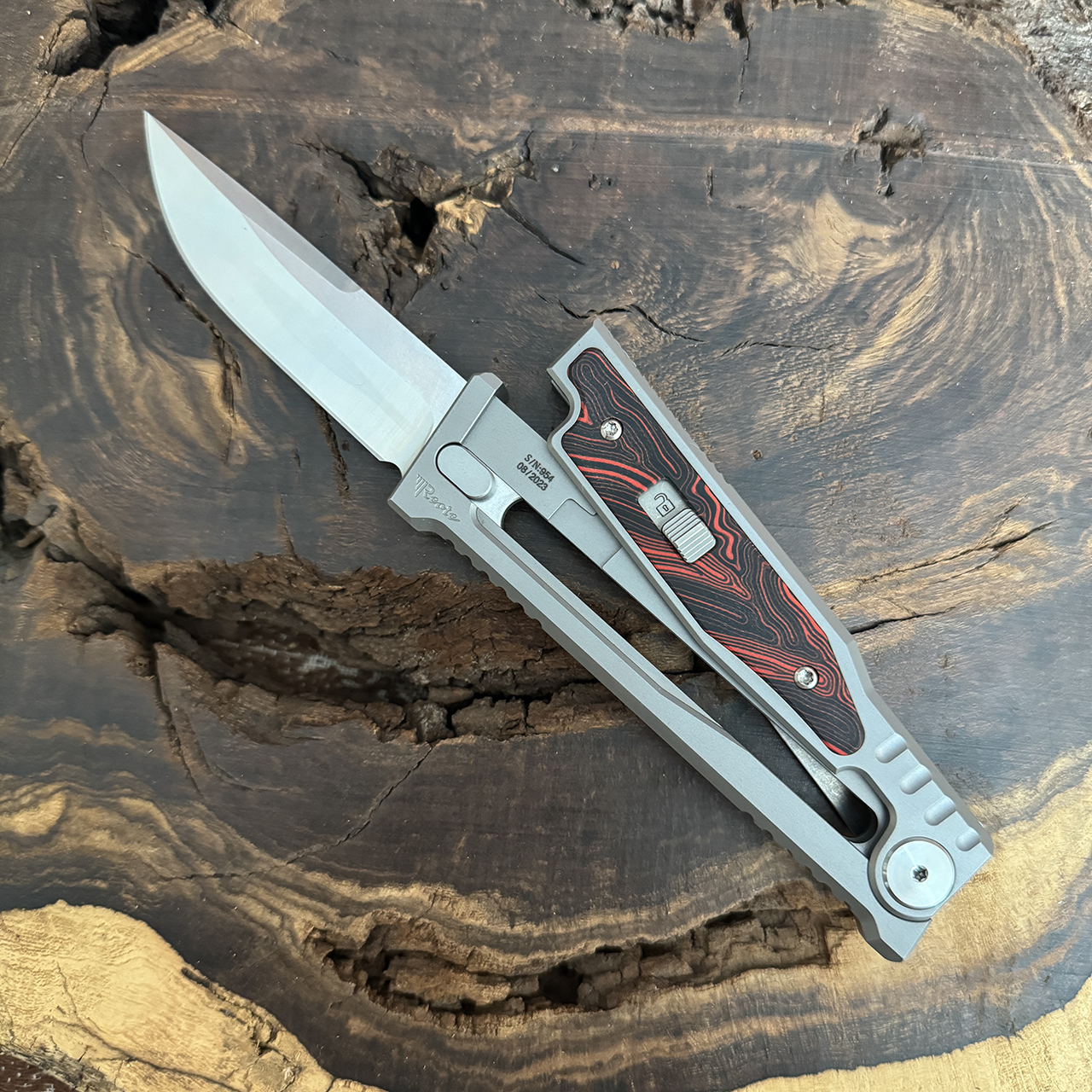 Reate EXO M S/E Gravity Knife Titanium Handle w/ Red Black G10 Damascus Pattern Inlay Satin Standard Blade