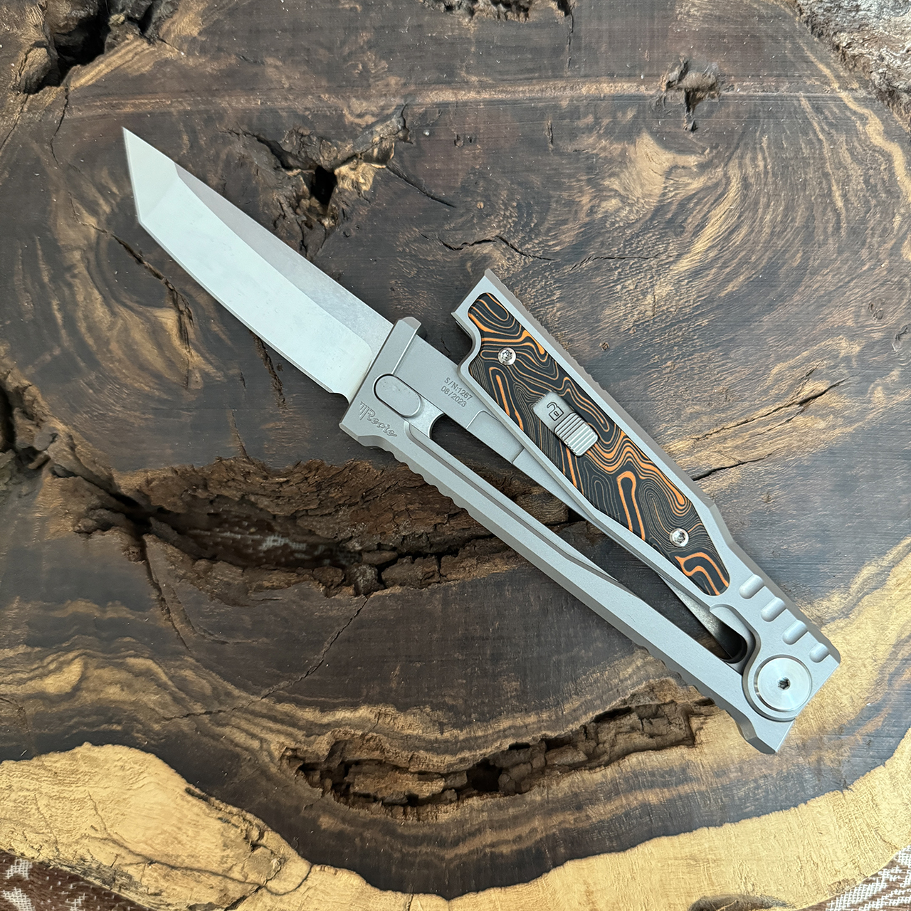 This model features a titanium handle with orange and black G10 Damascus Pattern inlay. Satin finished ELMAX tanto blade. Comes with original box and accessories.