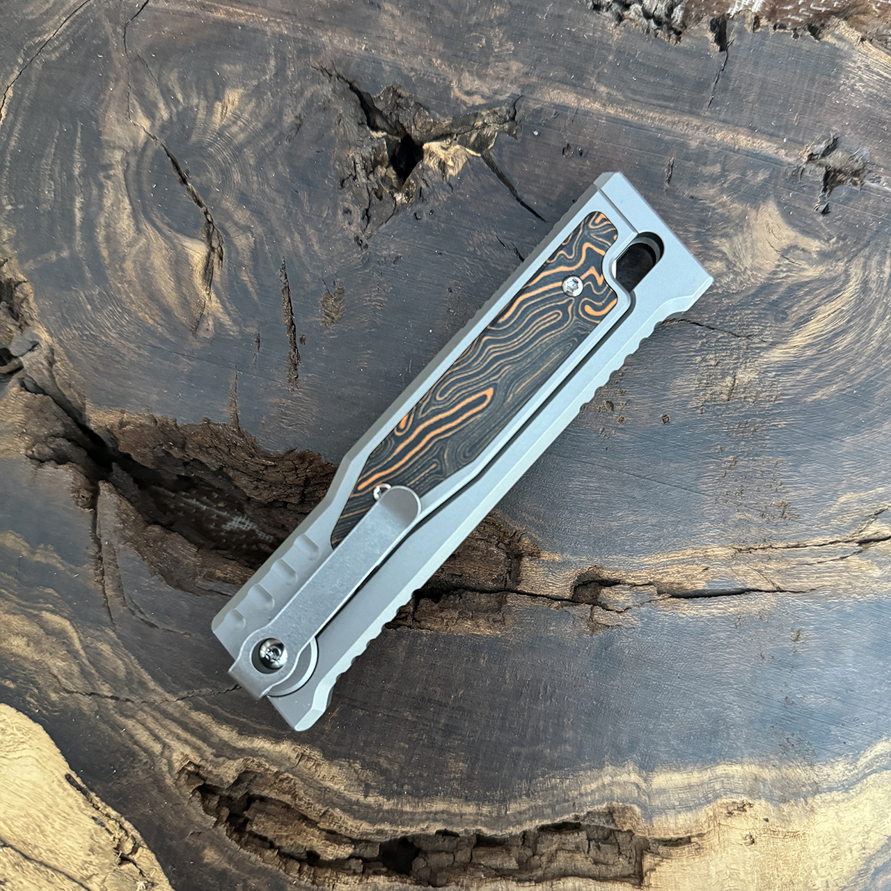 Reate EXO M T/E Gravity Knife Titanium Handle w/ Orange Black G10 Damascus Pattern Inlay Satin Blade