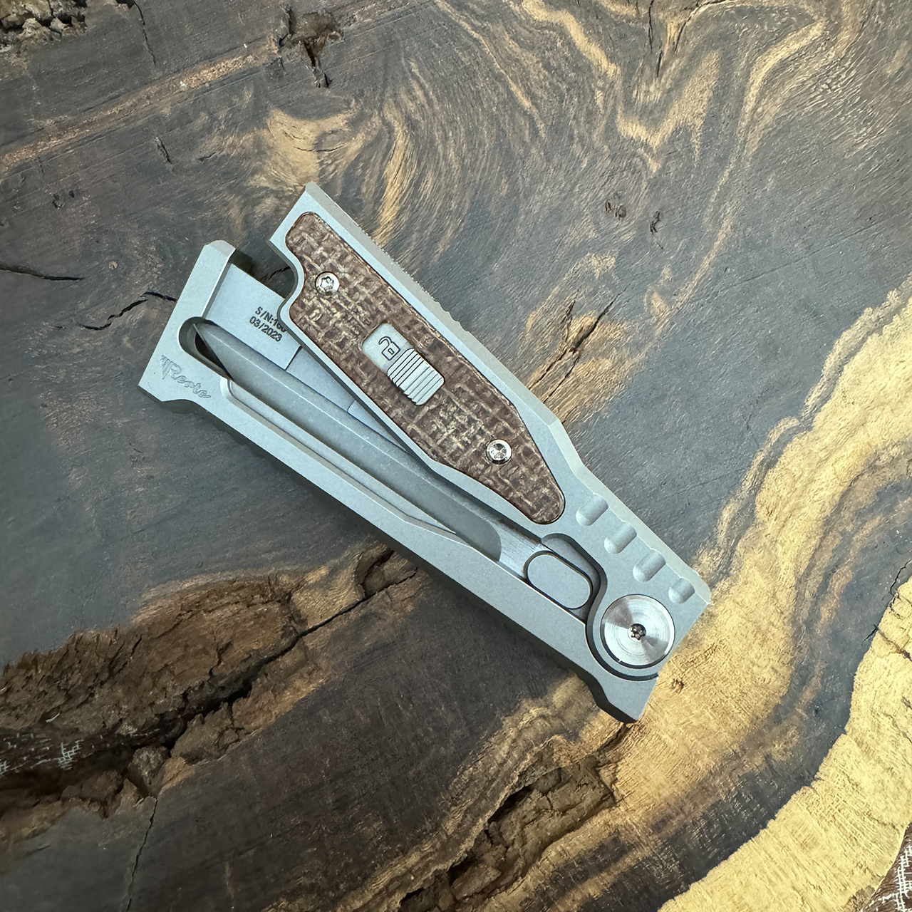 Reate EXO Mini D/E Gravity Knife Titanium Handle w/ Burlap Micarta Inlay Stonewash Standard Blade