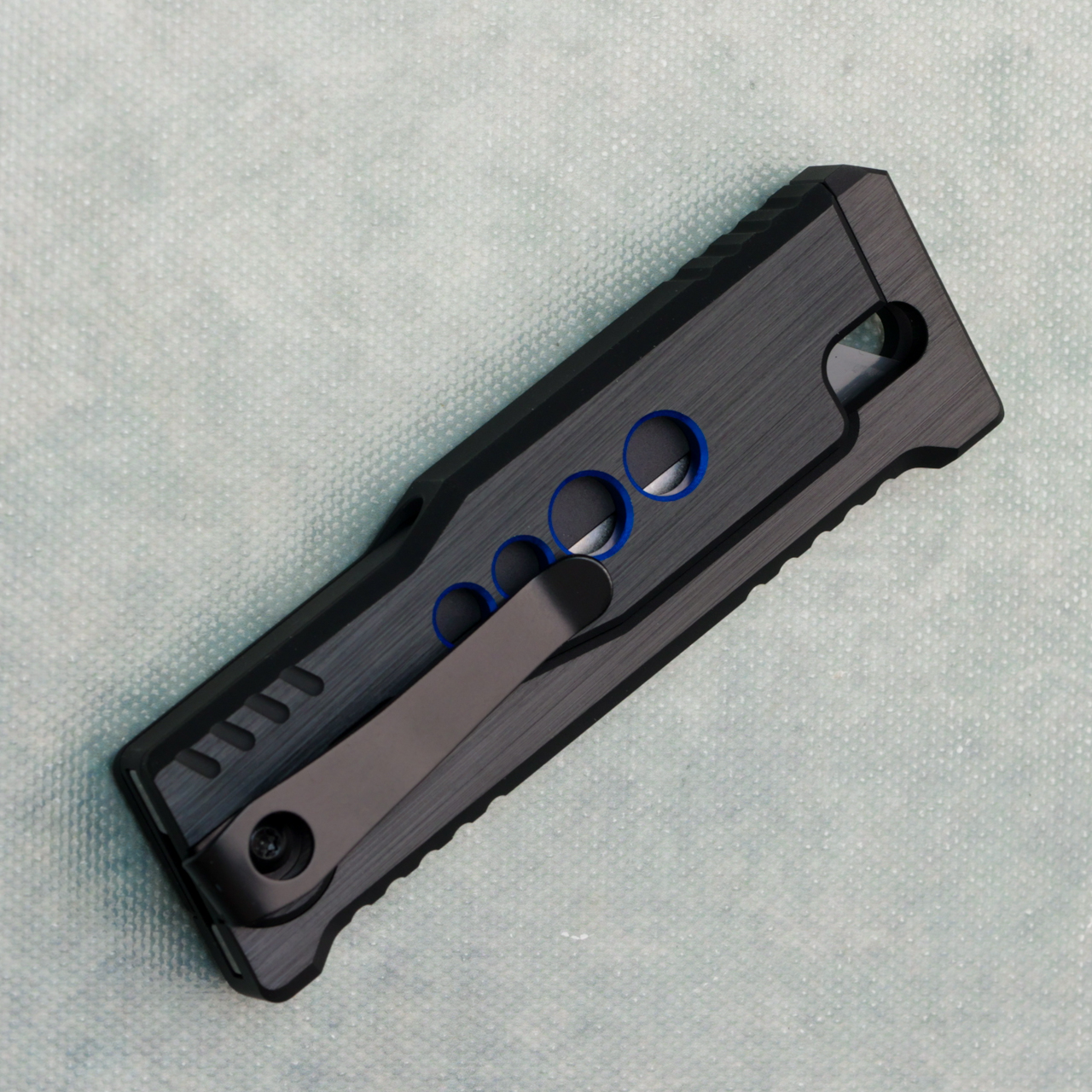 This model features black w/ blue speed hole aluminum handles. Stainless steel utility blade, and deep carry reversible pocket clip. Brand new in box.