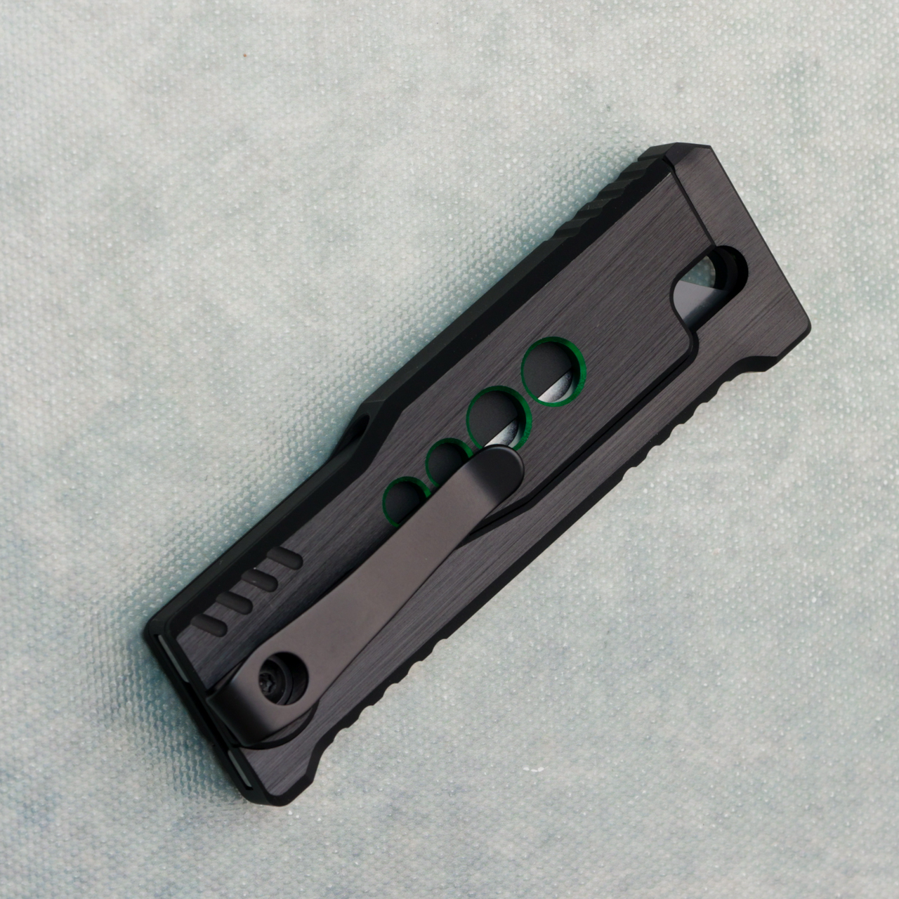 This model features black w/ green speed hole aluminum handles. Stainless steel utility blade, and deep carry reversible pocket clip. Brand new in box.