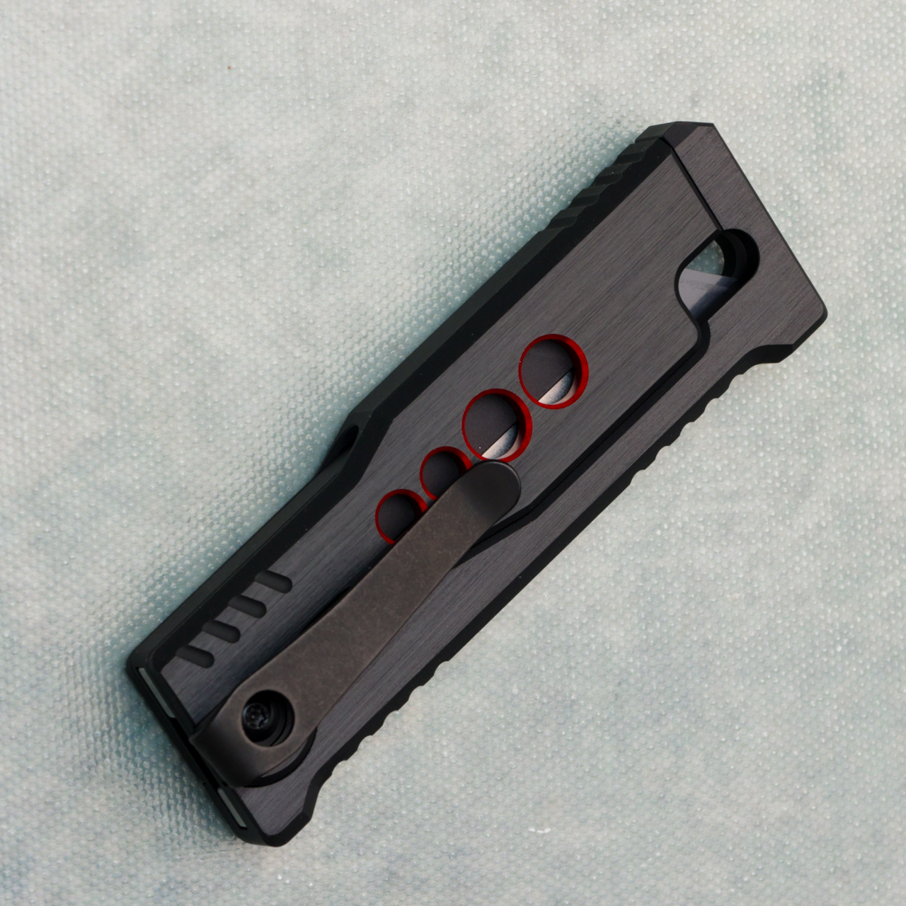 This model features black w/ red speed hole aluminum handles. Stainless steel utility blade, and deep carry reversible pocket clip. Brand new in box.