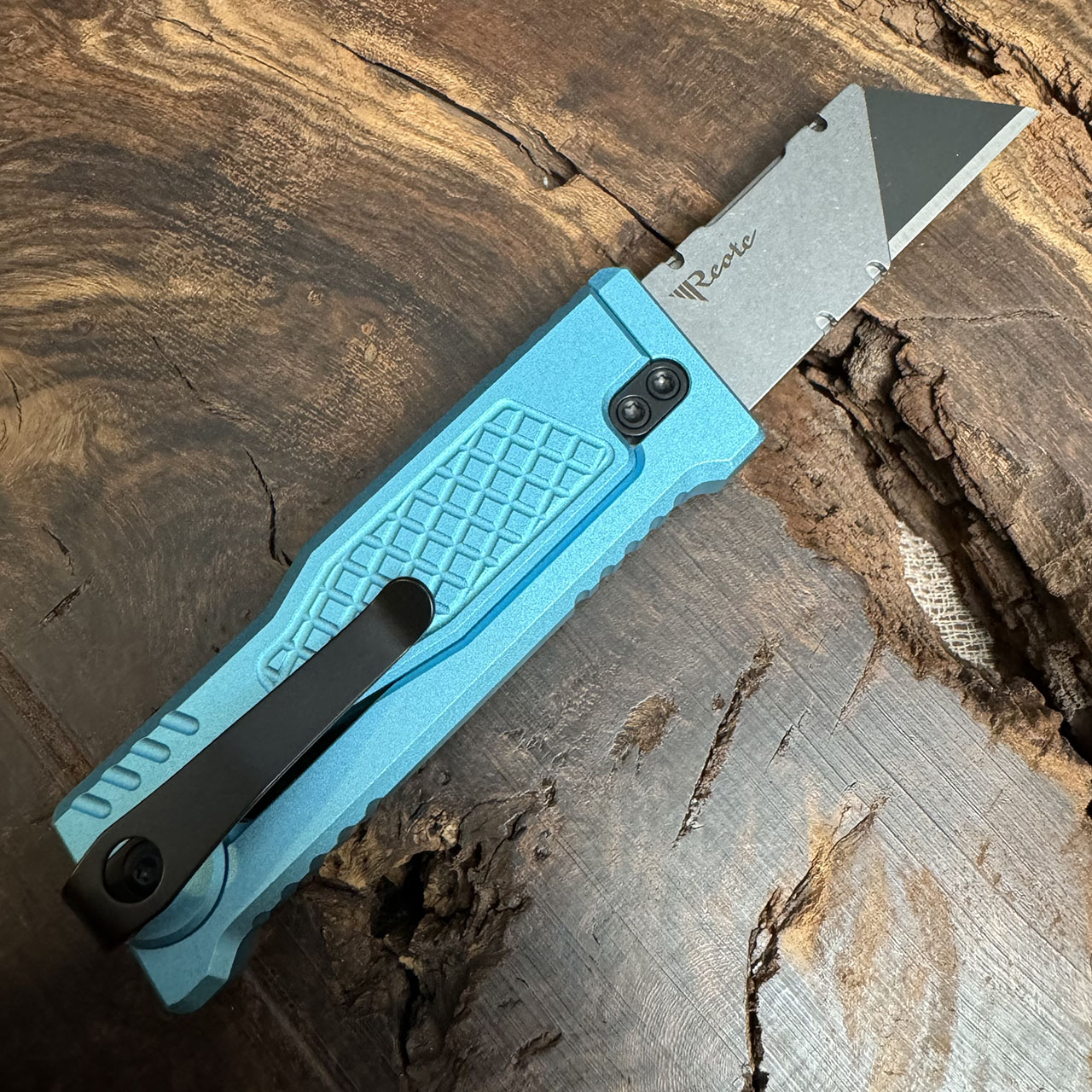 Reate EXO-U Utility Gravity Knife Blue Aluminum Diamond Patterned Handles