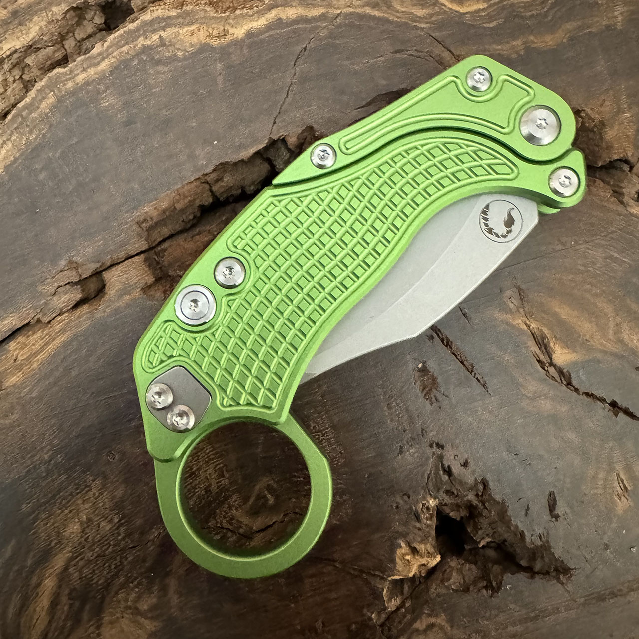 Reate Knives EXO-K Button Lock Karambit Gravity Knife Green Aluminum Handle Stonewash Blade w/ Trainer