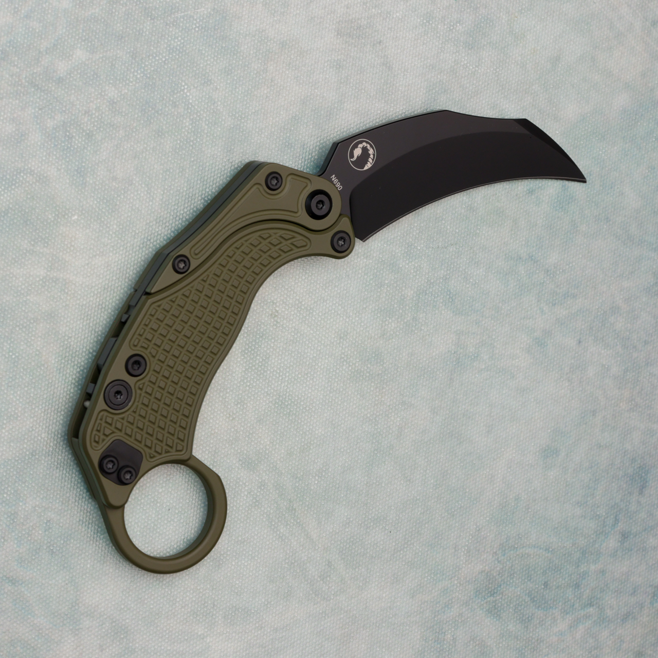 This model features green finished aluminum handle scales. Black finished Bohler N690 hawkbill blade. Brand new in box with trainer knife.
