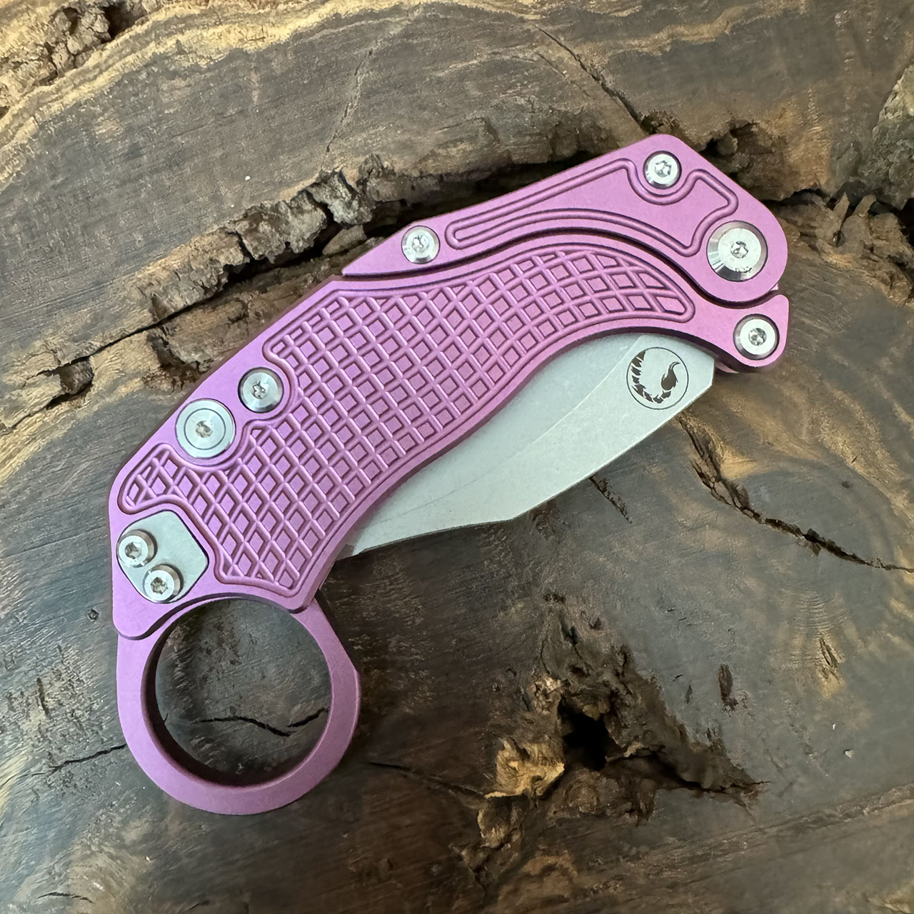 This model features purple finished aluminum handle scales. Stonewash finished Bohler N690 hawkbill blade. Brand new in box with trainer knife.