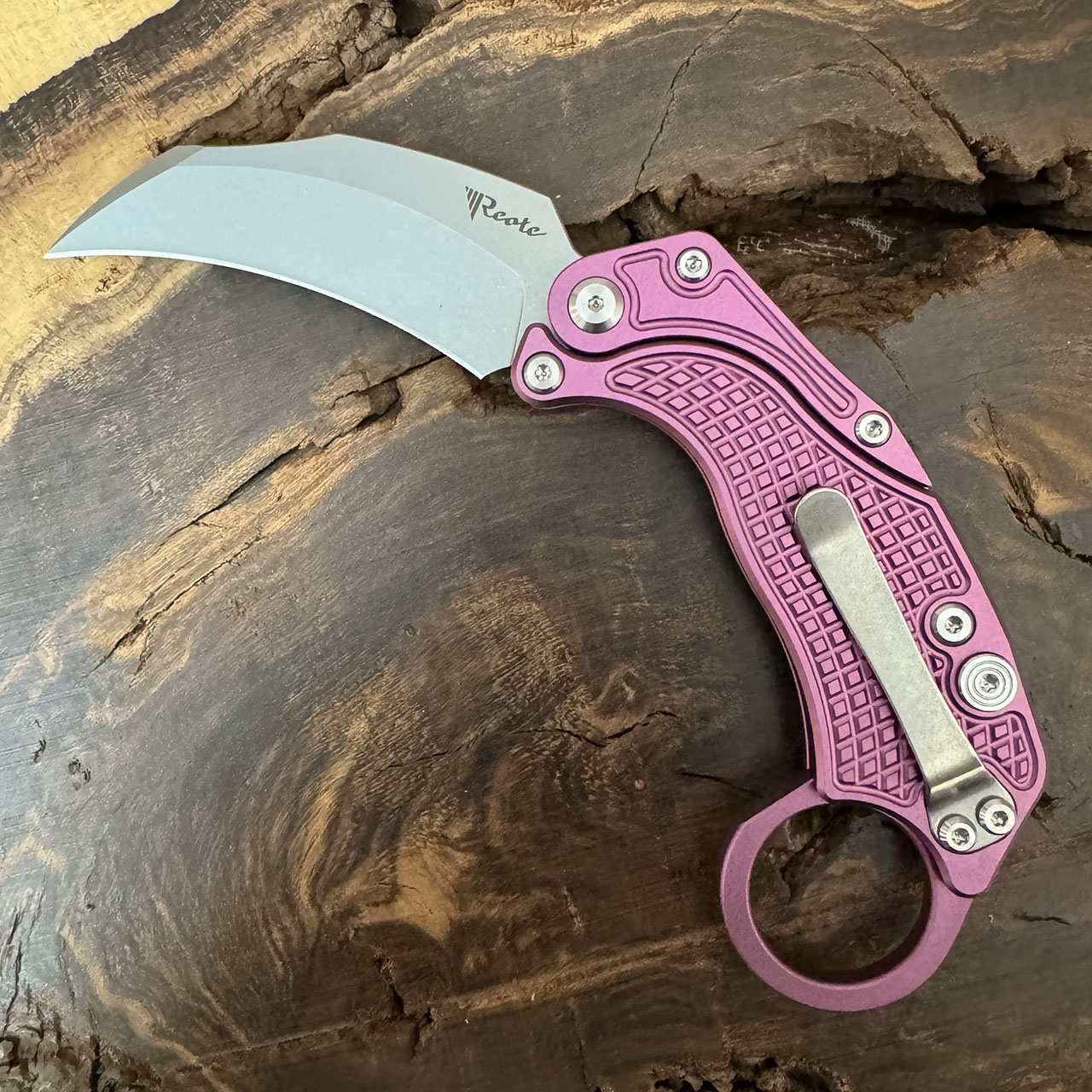Reate Knives EXO-K Button Lock Karambit Gravity Knife Purple Handle Stonewash Blade w/ Trainer