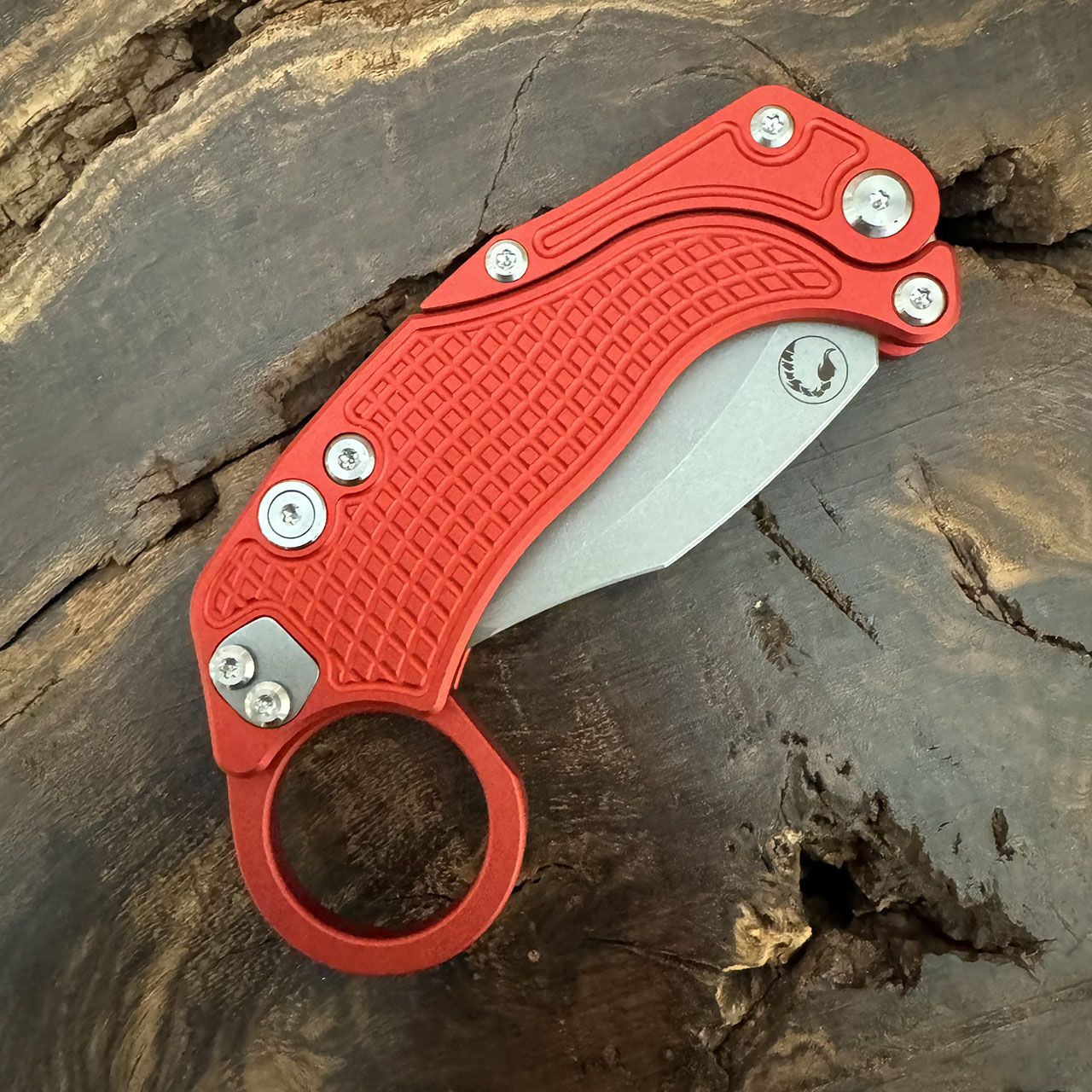 This model features red finished aluminum handle scales. Stonewash finished Bohler N690 hawkbill blade. Brand new in box with trainer knife.