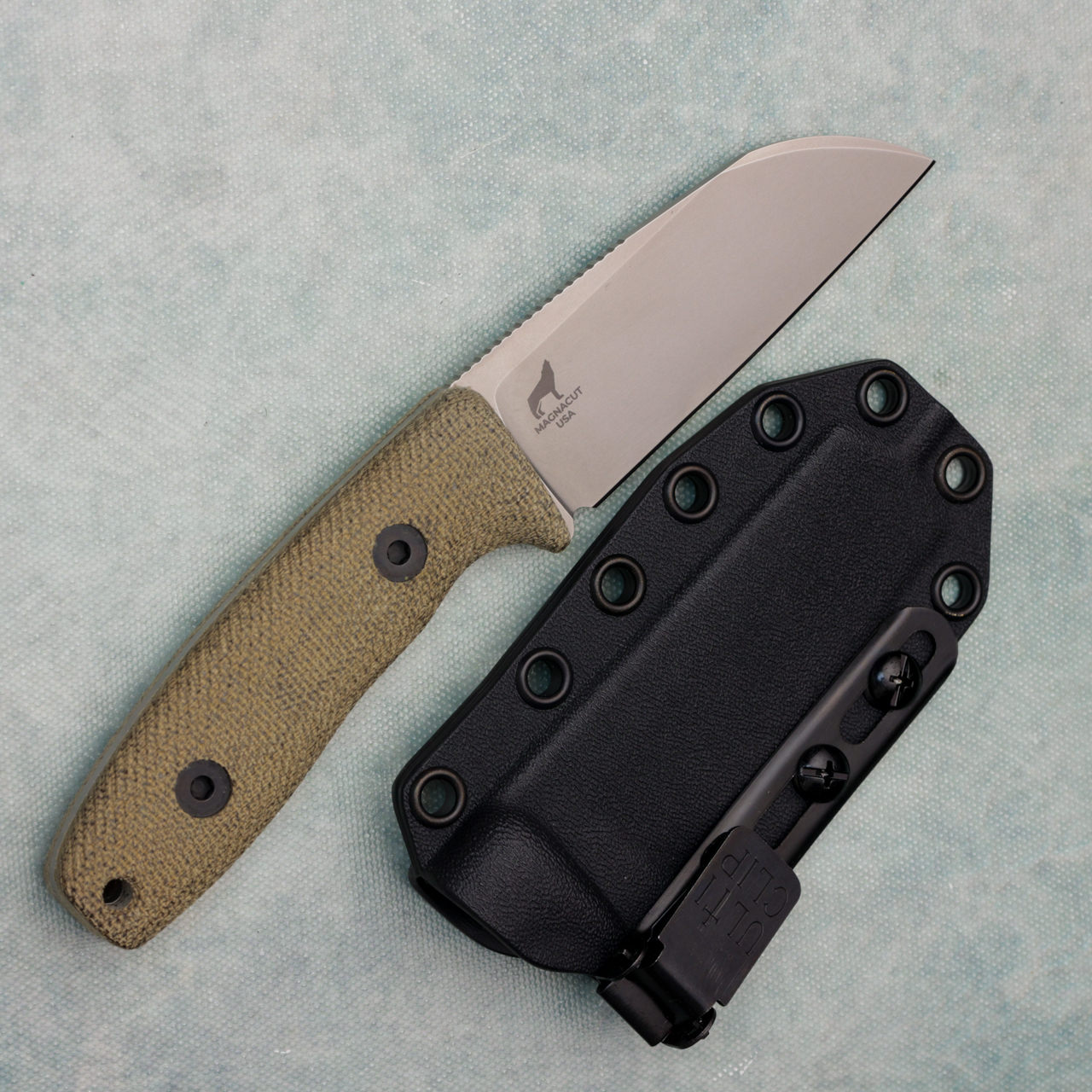 The 3.28” CPM MagnaCut blade is .12” thick at the spine making is the sliciest blade in our lineup. With a high, flat saber grind that is just shy of full flat, this knife glides through cardboard, animal hide and wood. The deep sweeping belly, fine edge and extreme corrosion resistance make it an exceptional option for hunting, fishing and most any general cutting task.