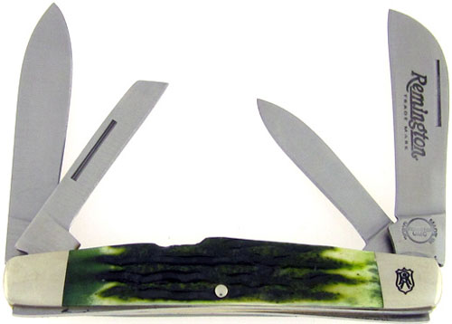Discontinued Remington Knife. Awesome green jigged bone handle scales. Satin finished stainless steel sheepsfoot blade REMINGTON TRADE MARK, spear point blade, coping blade, and pen blade. All four blades have long nail pulls and goos strong snap. Brass liners. Nickel silver bolsters and handle pins. The front bolster is etched with a crest logo shield. A fine pocket knife in this useful pattern. Brand new in original two piece box.