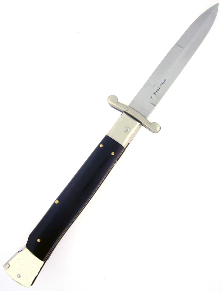 Real nice rosewood handle scales. Polished stainless steel bayonet style blade from thick stock. Tang stamped Maniago Italy with Renzo Pascotto's mark. Solid nickel silver bolsters, swing guard, scaleded button and sliding lock. Brass llners and handle pins. Excellent action. High quality custom Italian prototype auto by an Old Master from Maniago, Italy. Old world hand made, they do not make them like this anymore. A true masterpeice. A rare un-sharpened prototype heavy duty swing guard lock back auto by Renzo Pascotto not to be confused with Renzo Beltrame. Don't miss out you will not see these again anywhere ever.