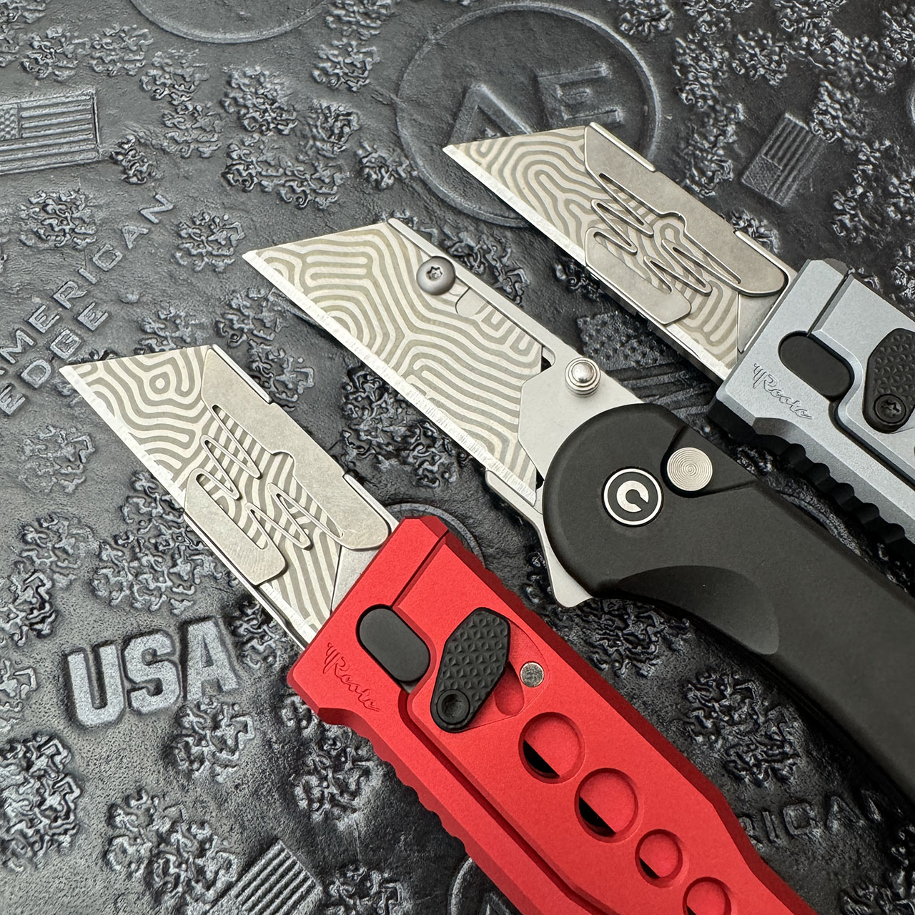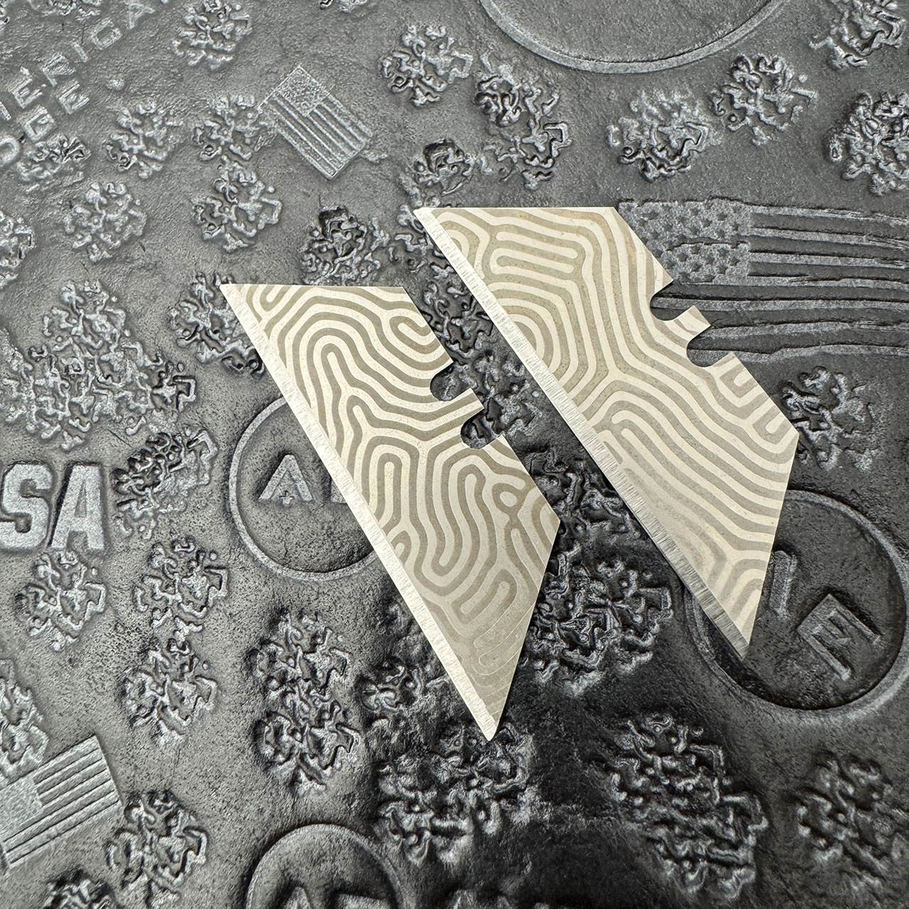 These are replacement utility razor blades for models like the Reate Exo-U and Civivi Elementum Utility and many more. These start out as a silver utility blade and are lasered in a G-Vascus pattern. Spice up your utility knife, and show it off! Listing is for utility blade(s) only. Knives are not included just shown in pictures to help show what your model can look like! Pattern will varry from blade to blade. Buy more and save!