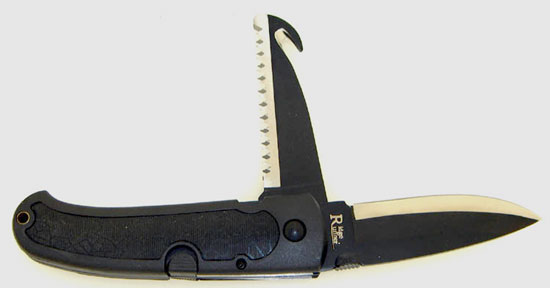 Ridge Runner 2 Blade, Folding Lock-back Hunter has drop point blade with thumb stud - 2nd blade is a Saw with guthook on top-side. Both blades lock up solid. Kraton inserts for sure grip; even when wet. Lanyard hole.