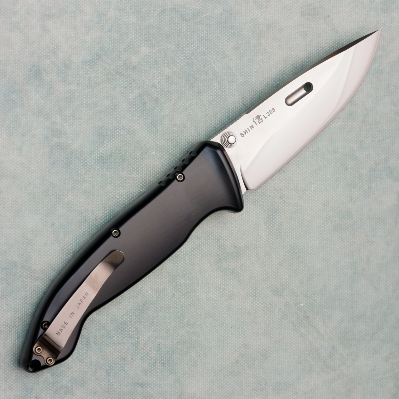 The Rockstead Shin is a solid knife with great action. It features black aluminum handles with stingray inlays and a ZDP189 blade with a mirror polish. Like new with box and papers.