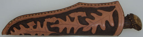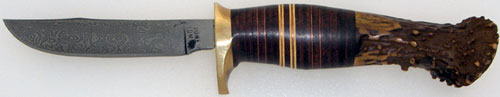 Another dandy knife by Ol' Mudbone. This small Scagel Style Southwest clip point damascus blade of 1084 & 15N20 tool steel, in a random pattern, further brought out by hand sanding with 2000 grit wet & dry paper. Guard is brass hand fit and soldered on. Handle has beautiful gnarley whitetail stag pommel with stacked leather and brass spacers. Extra nice Pouch has hand carved Oak & Acorn with hand painted back ground, then wet formed to knife.
