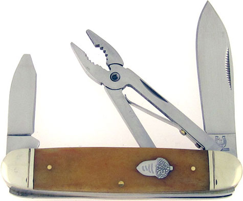 Nice tobacco smooth bone handle scales. Polished 440A stainless steel spear point blade, electrician's screwdriver blade, and pliers. The blades have good snap, match striker nail pulls, and are razor sharp. Nickel silver fluted bolsters and inlaid acorn shield. Brass liners and handle pins. Useful, durable, and cost effective electrician's pocket knife. Brand new in box.