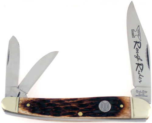 440 stainless steel clip point, sheepsfoot and spey blades. Genuine Brown Jigged Bone handles with nickel silver bolsters and inlaid shield. Brass liners and handle pins. Comes brand new in box.