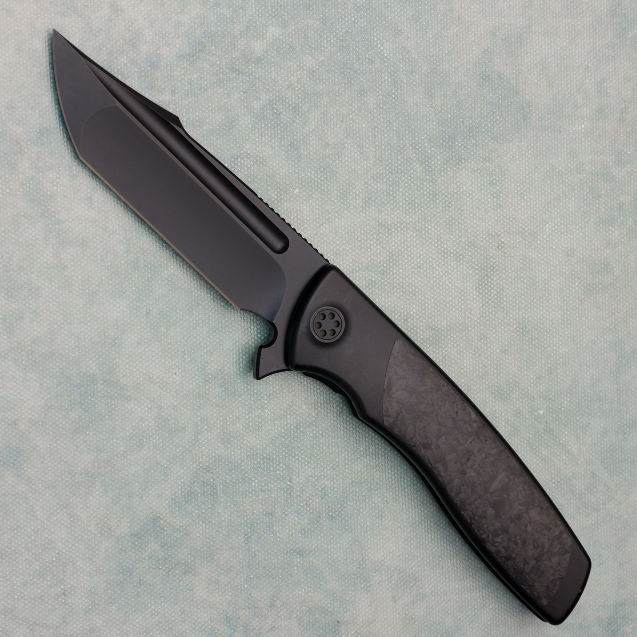 Sharp by Design Evo Typhoon with black titanium handles and carbon fiber inlays. Blade is black M390 harpoon tanto, and the knife has flipper deplyoment. It just has a mark on the clip, otherwise is in very good shape with the box.