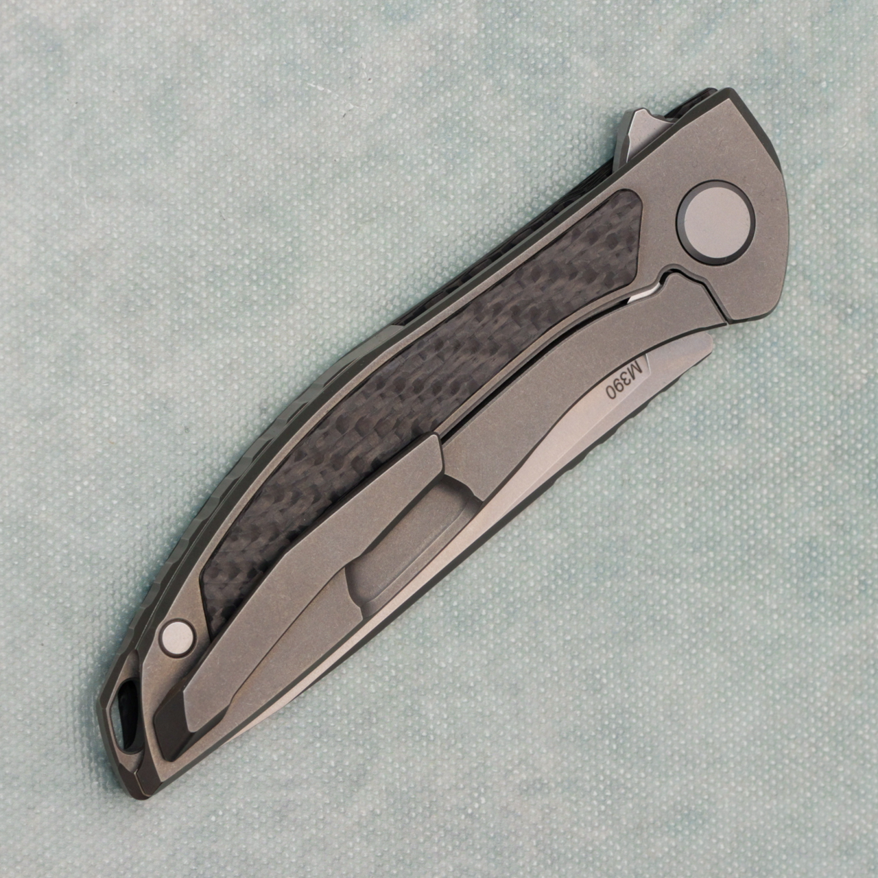 This HatiOn Zero framelock flipper from Shirogorov has a stonewashed M390 blade with a weave carbon handle and titanium clip side with carbon fiber inlay. Rides on MRBS. Includes a box, no coa. Excellent condition.