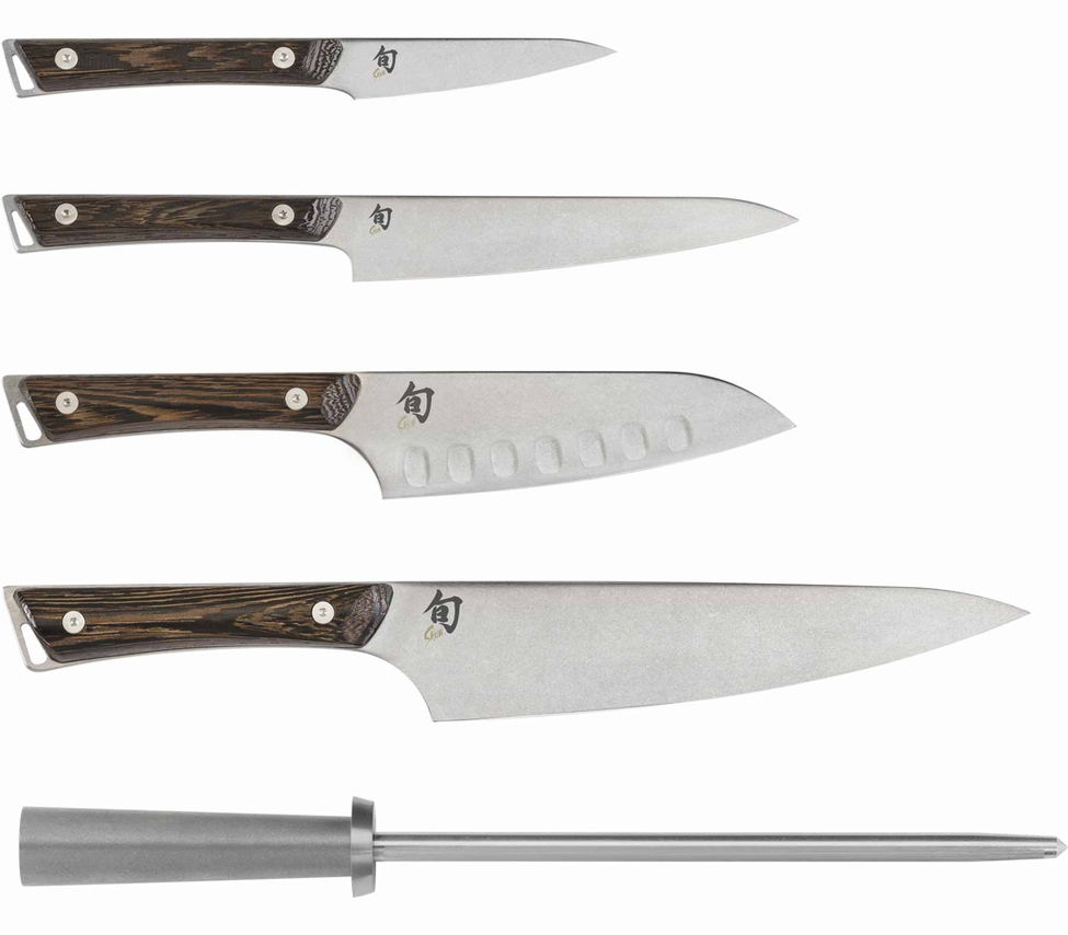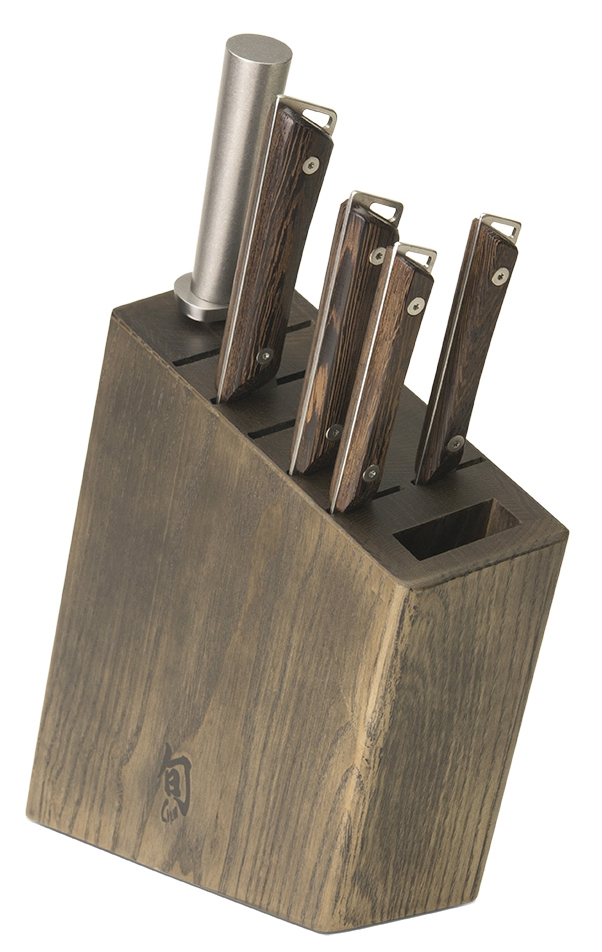 The Kanso 6-piece block features five key pieces of kitchen cutlery, plus a beautiful block with a finish to match the Kanso handle. You get the Kanso 8-inch Chef's Knife, 5.5-inch Hollow-Ground Santoku, 6-inch Utility Knife, 3.5-inch Paring Knife, and the Kanso Combination Honing Steel. They all fit in the solid wood block—with room to expand. There are two additional slots, plus one to accommodate a handy pair of kitchen shears.