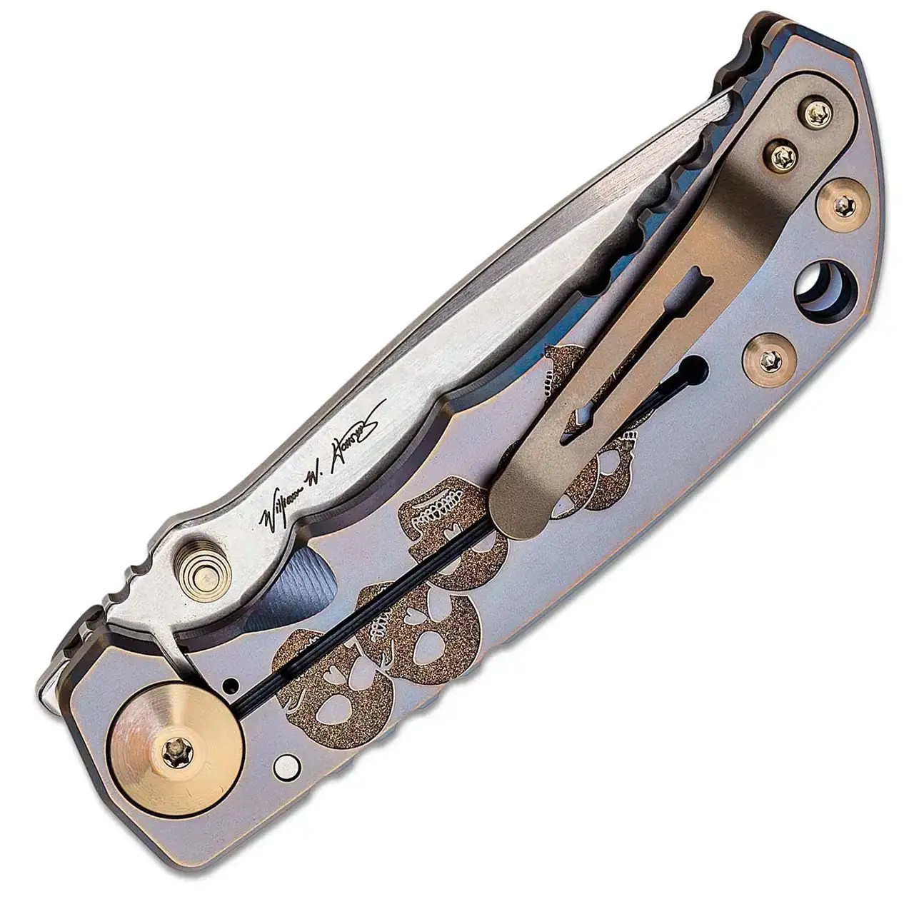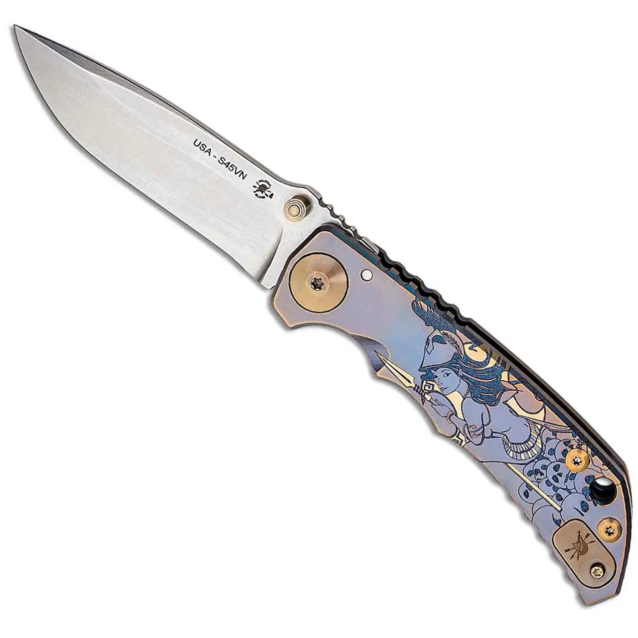 This limited edition model features a blue, deep engraved titanium handle with intricate Spartan Babe design. Stonewash finished CPM-S45VN drop point blade with standard cutting edge. Titanium tip-up clip featuring the Spartan Arrow and bronze hardware. The blade features Willaim Harsey Jr.'s signature on the back. Brand New in box. Made in the USA.