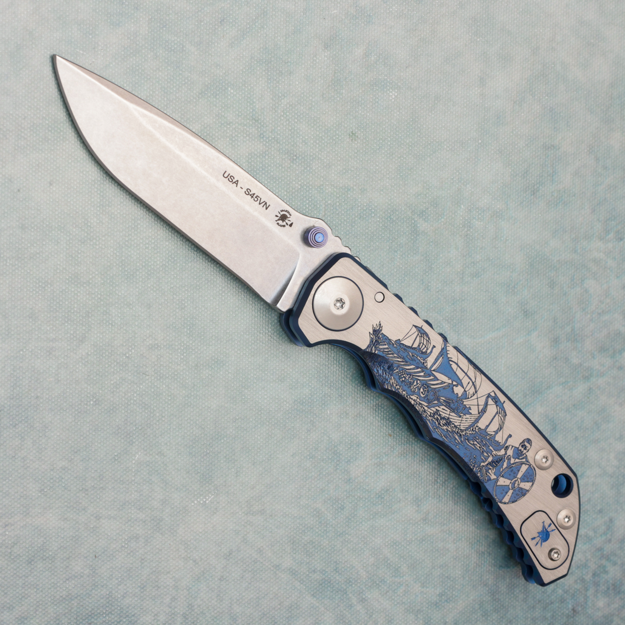 This limited edition model features a blue deep engraved titanium handle with intricate Viking Longboat design and "Till Vahalla" on the back. Stonewash finished CPM-S45VN drop point blade with standard cutting edge. Titanium tip-up clip featuring the Spartan Arrow. The blade features Willaim Harsey Jr.'s signature on the back. Brand New in box. Made in the USA.