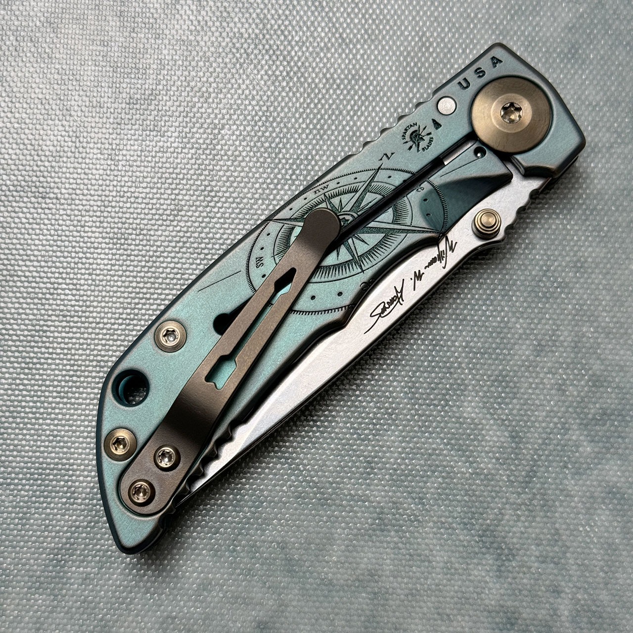 This custom model features a compass titanium handle. Stonewashed finished CPM-S45VN drop point blade with standard cutting edge. Titanium tip-up clip featuring the Spartan Arrow and satin hardware. The blade features Willaim Harsey Jr.'s signature on the back. The Handle features the Spartan Blades logo and USA. Brand New in box. Made in the USA.