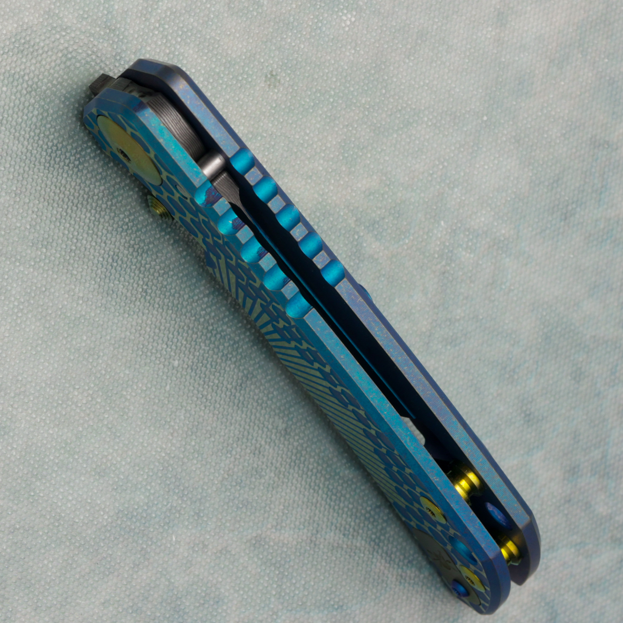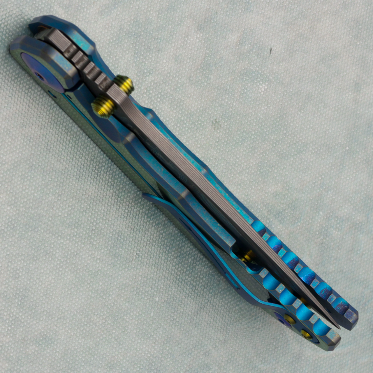 This custom model features a blue/gold titanium handle with intricate octaburst design. Chad Nichols Damascust drop point blade with standard cutting edge. Titanium tip-up clip featuring the Spartan Arrow. The blade features Willaim Harsey Jr.'s signature on the back. Ano got a little darker in some of the deep grooves on side of handles as shown. Brand New in box. Made in the USA.