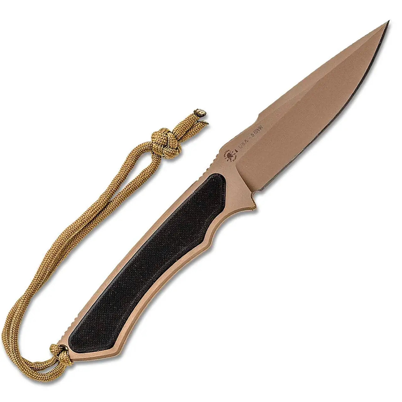 This model features a black G10 handle. Flat Dark Earth PVD finished CPM-S45VN swedged drop point blade with standard cutting edge. The Blade features the Spartan Blades logo and steel information. Comes with tan kydex sheath. Brand New in box. Made in the USA.