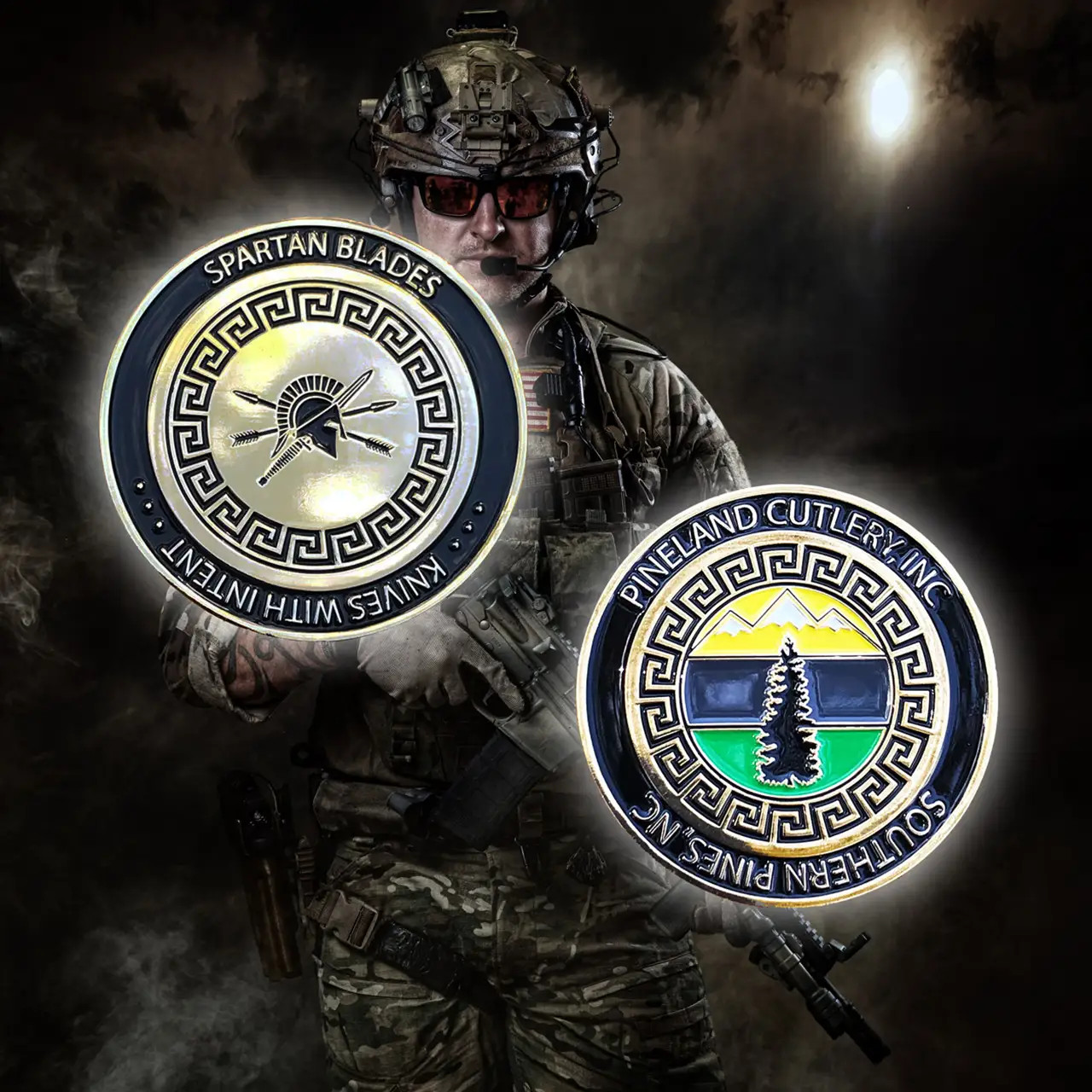 "This coin represents the Pineland and Spartan Blades Team. In 2019 Spartan Blades and KABAR Knives formed Pineland Cutlery, Inc and to honor this union, they created this new Honor/Challenge coin. 2" diameter