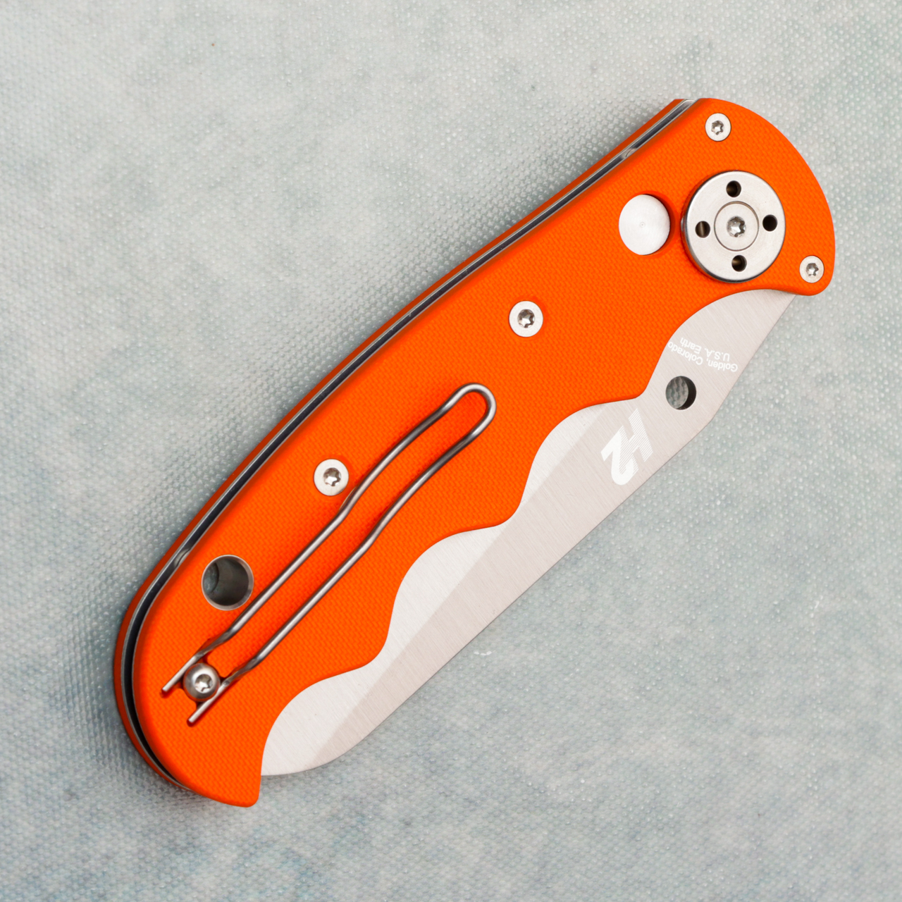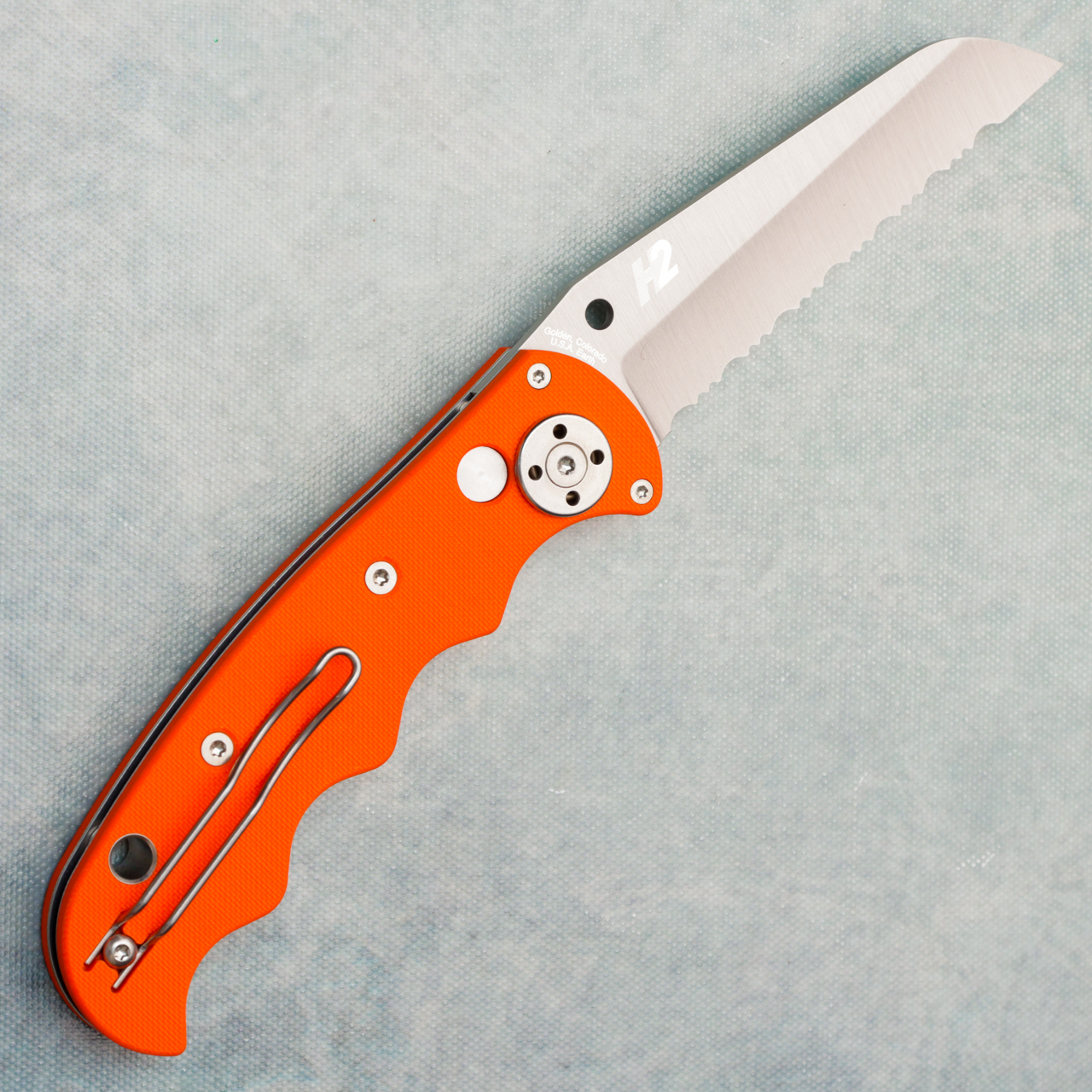 The Autonomy’s ergonomic, finger grooved handle is constructed with full stainless steel liners flanked by textured orange G10 scales. Its oversized firing button is powered by a spring that is integral to one of the liners and includes a sliding safety that prevents unintentional activation. The handle’s other metal hardware including its reversible wire pocket clip is also made exclusively from corrosion resistant materials. Brand new in box.