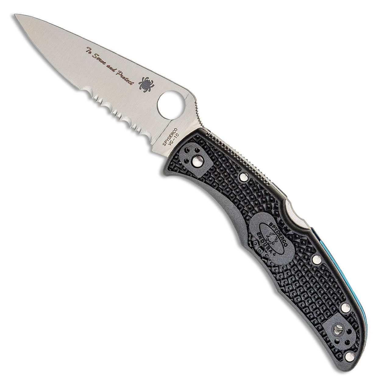 Unlike the standard expression of this model, the VG-10 stainless steel blade combines the low friction edge geometry of a full flat grind with the extreme cutting power of Spyderco serrations. It is also laser engraved with the motto "To Serve and Protect" to honor the service and sacrifice of law enforcement professionals. Brand new in box.