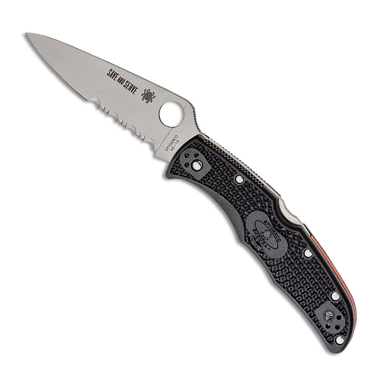The VG-10 blade of this Endura 4 Lightweight also combines the enhanced edge geometry of a full flat grind with the voracious cutting power of Spyderco serrations. To honor the selfless service of first responders, every blade is proudly laser engraved with the motto "Save and Serve." All other features of these elite knives are consistent with the standard version of this model, including a reliable back lock mechanism, skeletonized stainless steel liners, four position pocket clip, and Bi Directional Texturing. Brand new in box.